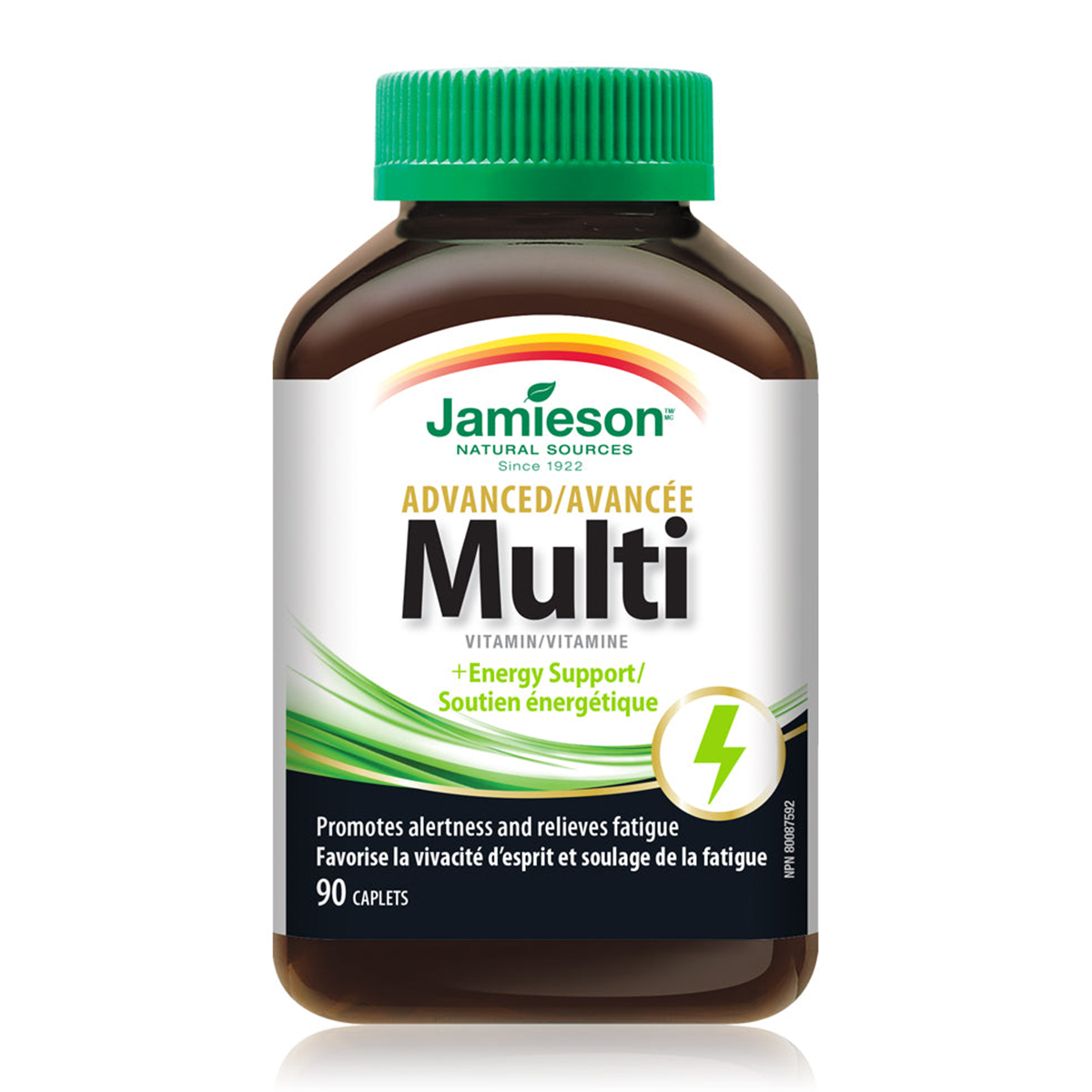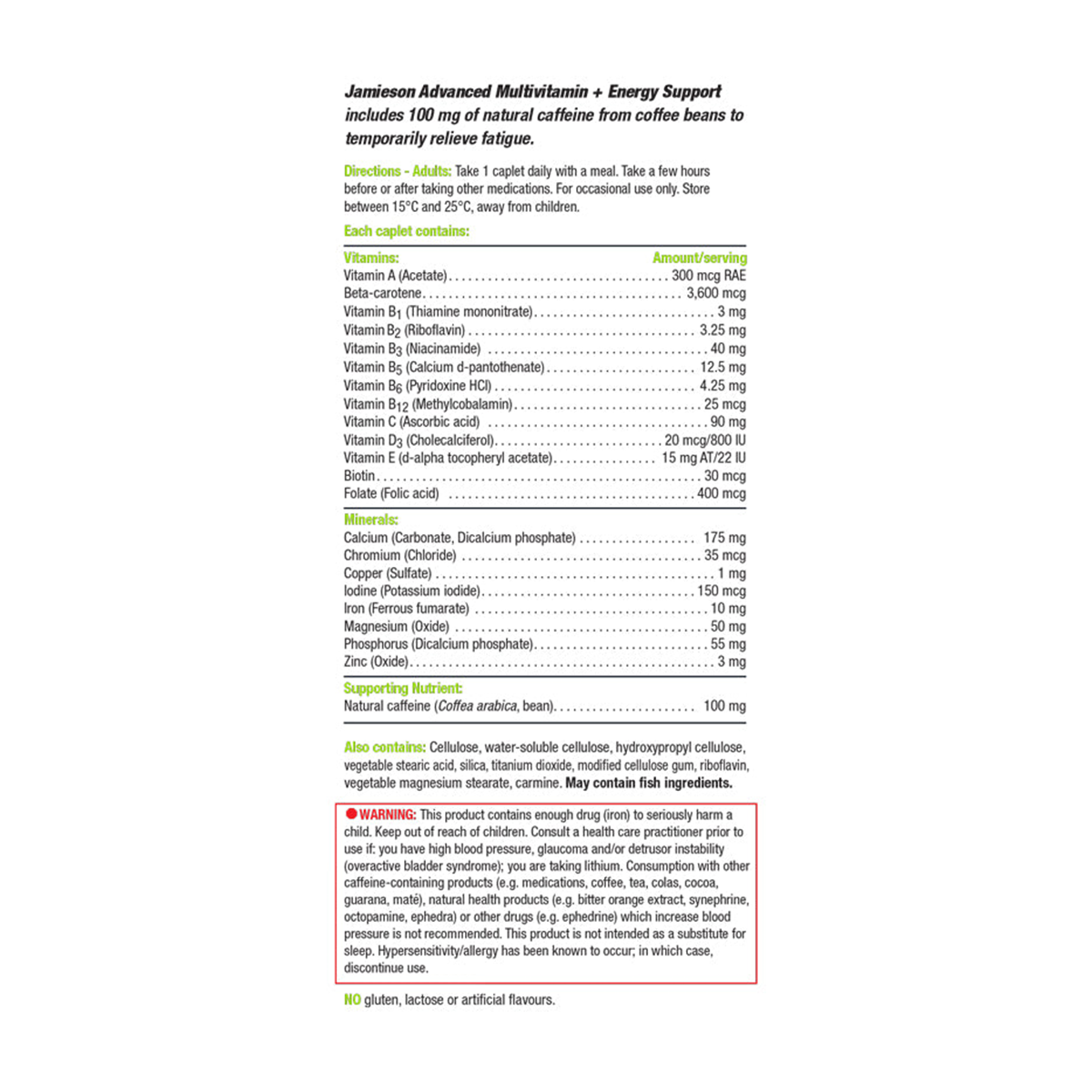 Jamieson Advanced Multi + Energy Aid is the easy way to get 100% of your body's daily vitamin needs. Formulated with 100 mg of natural caffeine from coffee beans, this daily multivitamin temporarily relieves fatigue and promotes alertness.