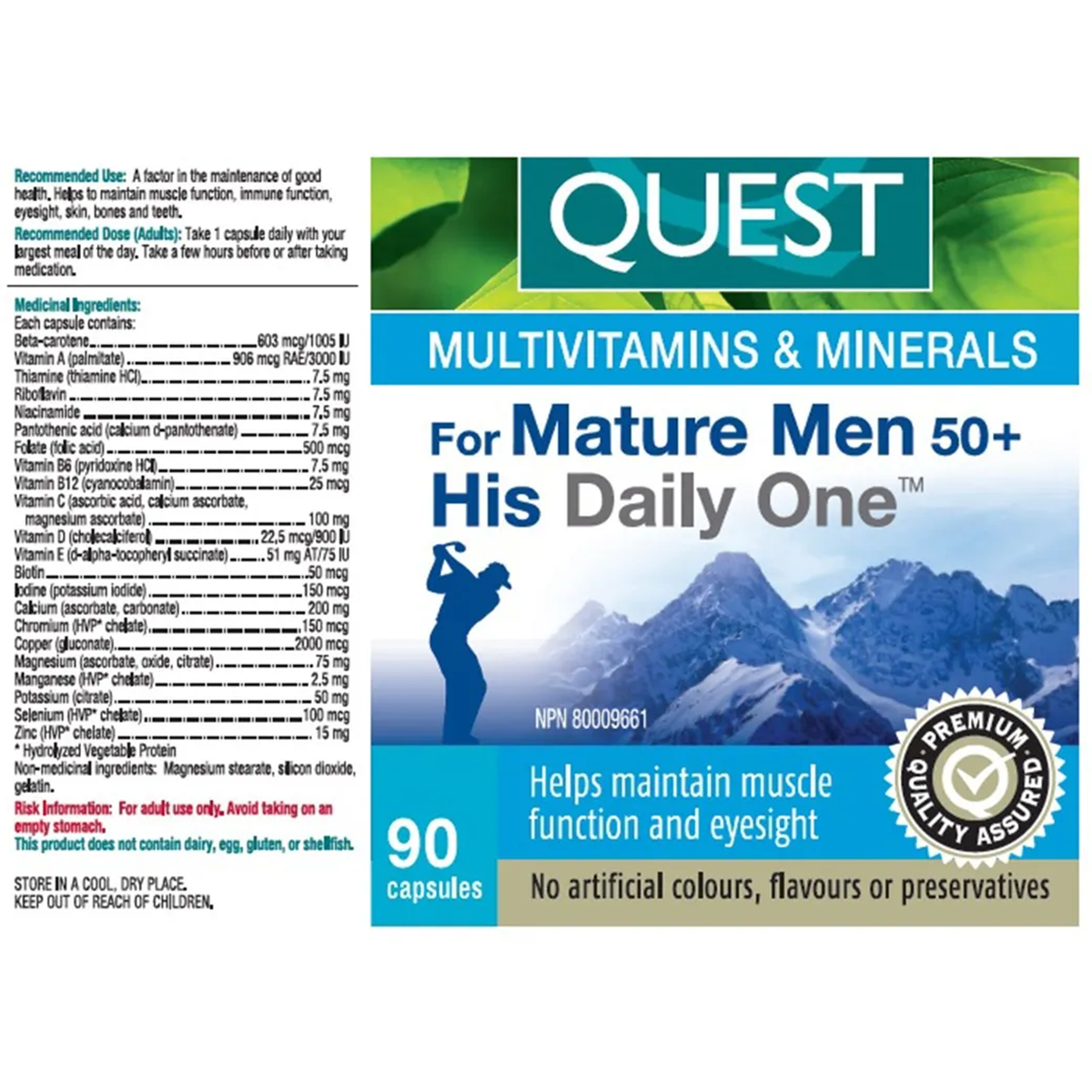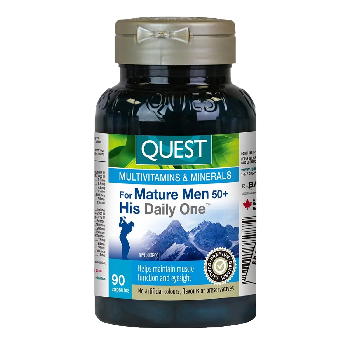 Quest His Daily One for Mature Men 50+ is a high-quality, well-balanced, one-a-day multivitamin and mineral supplement designed specifically to meet the life-stage and gender needs of men over 50. Formulated as a capsule, this supplement is easily absorbed and easy to swallow, and it provides all the nutrients required to maintain muscle function, immune function, eyesight, and overall good health.