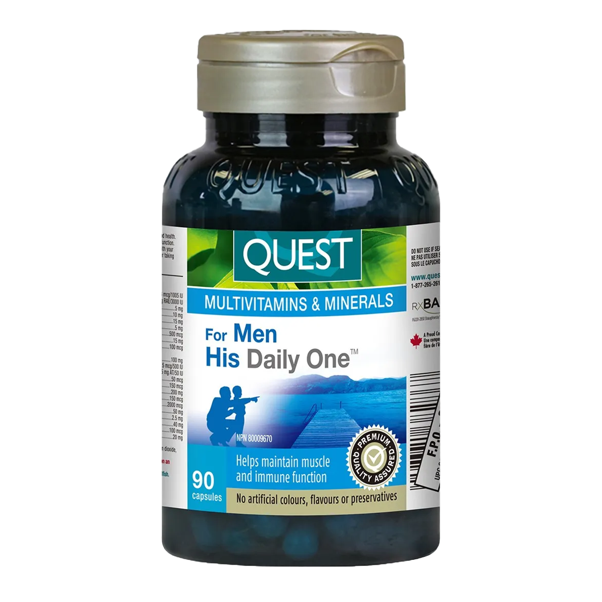 Quest His Daily One for Men is a high-quality, well-balanced, one-a-day multivitamin and mineral supplement designed specifically to meet the life-stage and gender needs of men. Formulated as a capsule, this supplement is easily absorbed and easy to swallow, and it provides all the nutrients required to maintain muscle and immune function and overall good health.