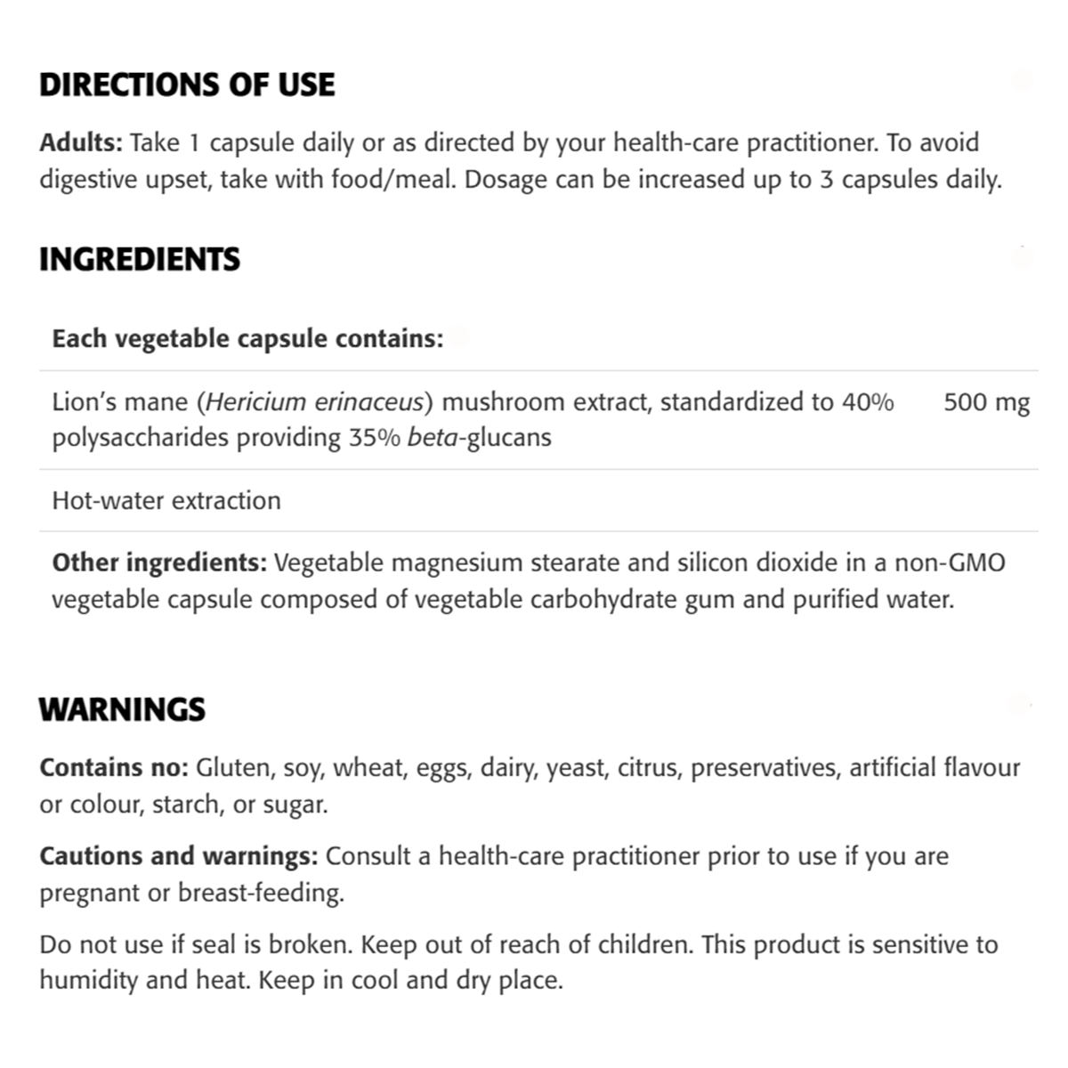 Lion’s mane (Hericium erinaceus) mushroom extract, standardized to 40% polysaccharides providing 35% beta-glucans
