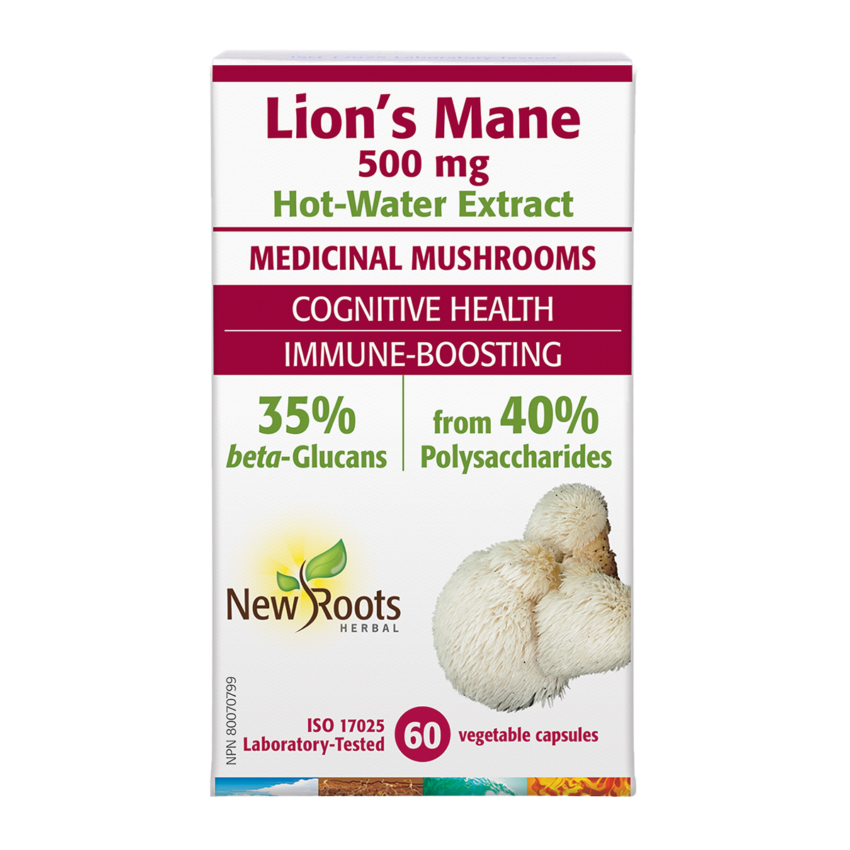 New Roots Herbal presents Lion’s Mane (Hericium erinaceus), a hot water–extracted medicinal mushroom formula standardized to contain 40% polysaccharides (500 mg per capsule). Hot-water extraction, the traditional Asian method, is critical for obtaining a high-quality and effective mushroom product. In the whole mushroom, polysaccharides are bound by an indigestible cell wall comprised of chitin; hot water is needed to gently release the medicinal components, the mushroom polysaccharides. Conversely, grinding the mushroom may cause damage to the long-chain polysaccharides and fails to remove the indigestible chitin (fibre), limiting the amount of therapeutic constituents that can be fit per capsule. Standardization ensures that the final product contains a consistent amount of polysaccharides to allow the delivery of a therapeutic dose.
