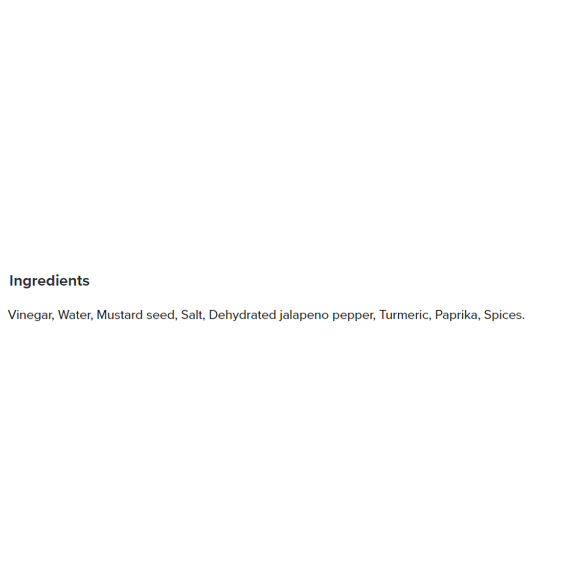 Vinegar, Water, Mustard seed, Salt, Dehydrated jalapeno pepper, Turmeric, Paprika, Spices.