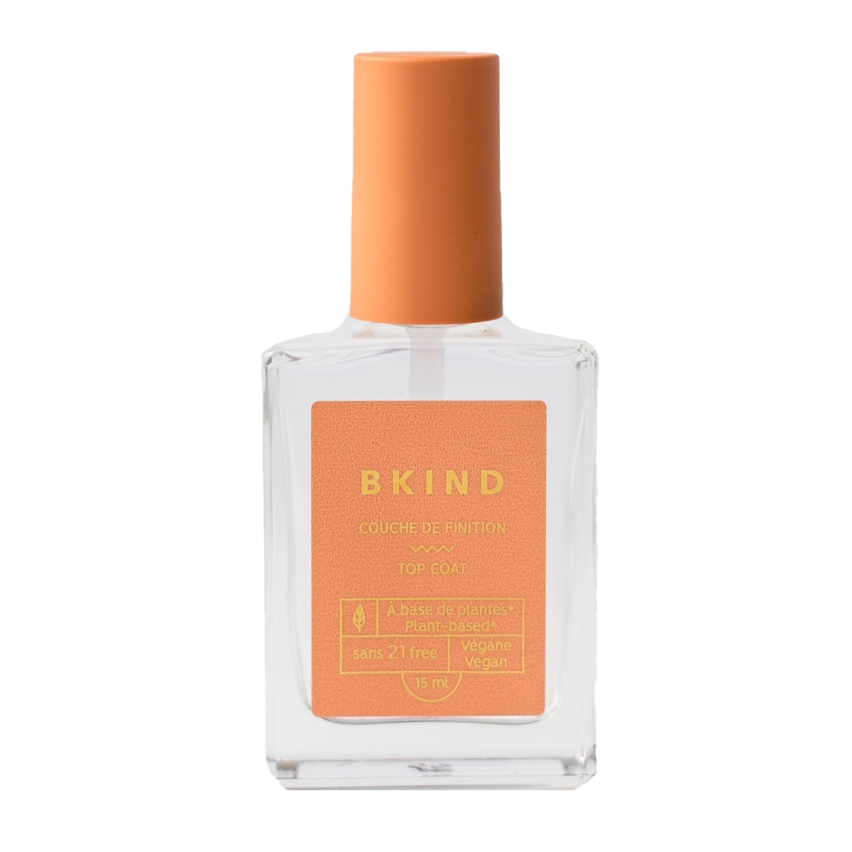 Perfect glossy finish and hides imperfections. Finish your manicure or pedicure the right way with this non toxic and vegan top coat. BKIND fast-drying nail polish top coat adds a perfect glossy finish to your manicure or pedicure and hides imperfections. It also contains an UV inhibitor which prevents yellowing.