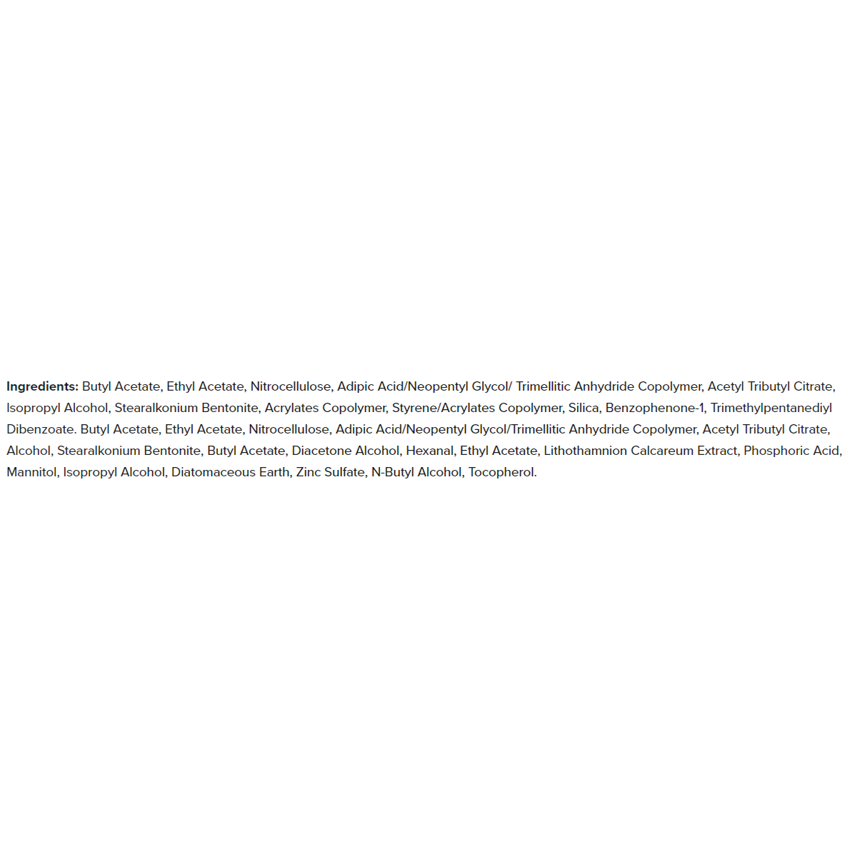Butyl Acetate, Ethyl Acetate, Nitrocellulose, Adipic Acid/Neopentyl Glycol/ Trimellitic Anhydride Copolymer, Acetyl Tributyl Citrate, Isopropyl Alcohol, Stearalkonium Bentonite, Acrylates Copolymer, Styrene/Acrylates Copolymer, Silica, Benzophenone-1, Trimethylpentanediyl Dibenzoate. Butyl Acetate, Ethyl Acetate, Nitrocellulose, Adipic Acid/Neopentyl Glycol/Trimellitic Anhydride Copolymer, Acetyl Tributyl Citrate, Alcohol, Stearalkonium Bentonite, Butyl Acetate, Diacetone Alcohol, Hexanal, Ethyl Acetate, Lithothamnion Calcareum Extract, Phosphoric Acid, Mannitol, Isopropyl Alcohol, Diatomaceous Earth, Zinc Sulfate, N-Butyl Alcohol, Tocopherol.