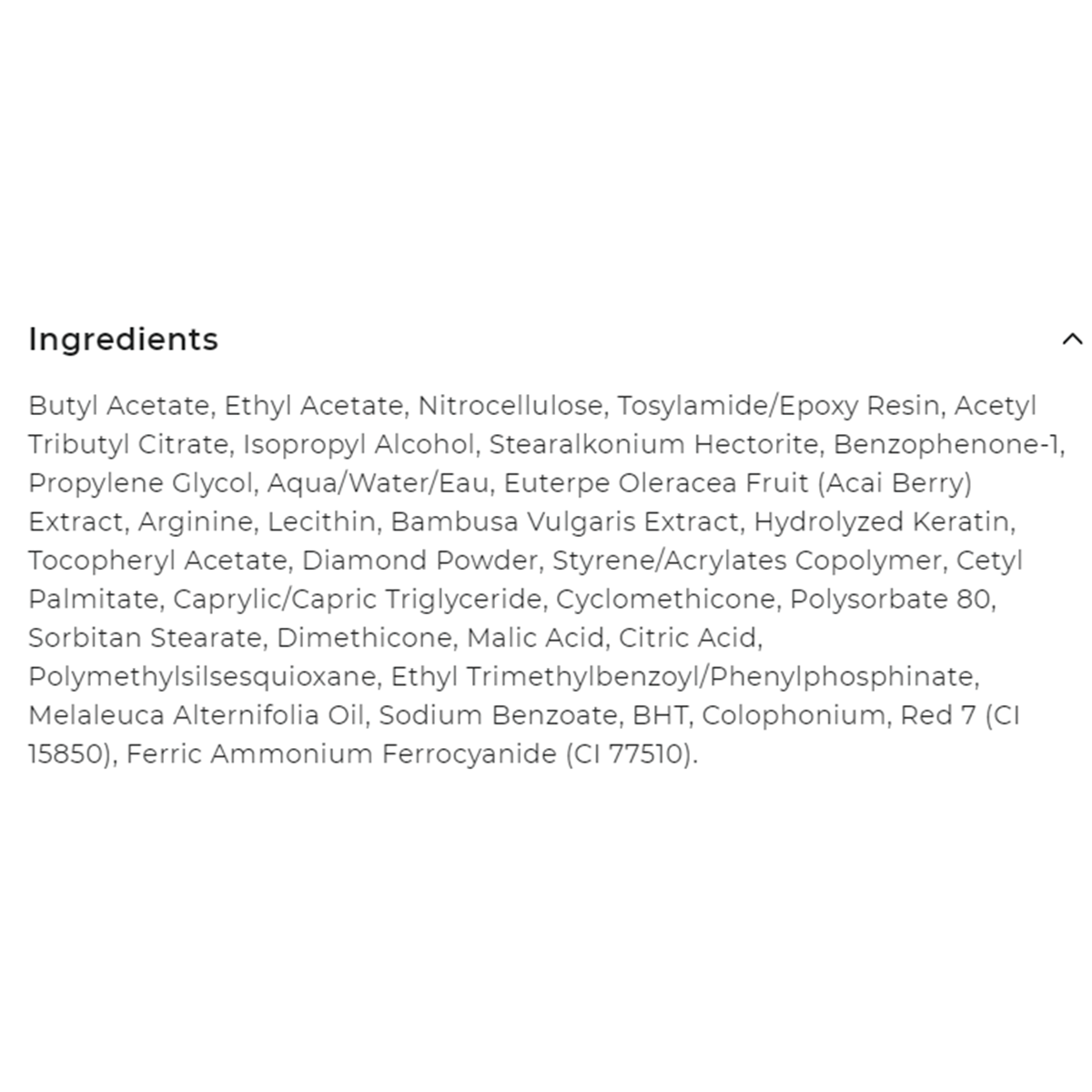 Butyl Acetate, Ethyl Acetate, Nitrocellulose, Tosylamide/Epoxy Resin, Acetyl Tributyl Citrate, Isopropyl Alcohol, Stearalkonium Hectorite, Benzophenone-1, Propylene Glycol, Aqua/Water/Eau, Euterpe Oleracea Fruit (Acai Berry) Extract, Arginine, Lecithin, Bambusa Vulgaris Extract, Hydrolyzed Keratin, Tocopheryl Acetate, Diamond Powder, Styrene/Acrylates Copolymer, Cetyl Palmitate, Caprylic/Capric Triglyceride, Cyclomethicone, Polysorbate 80, Sorbitan Stearate, Dimethicone, Malic Acid, Citric Acid, Polymethylsilsesquioxane, Ethyl Trimethylbenzoyl/Phenylphosphinate, Melaleuca Alternifolia Oil, Sodium Benzoate, BHT, Colophonium, Red 7 (CI 15850), Ferric Ammonium Ferrocyanide (CI 77510).