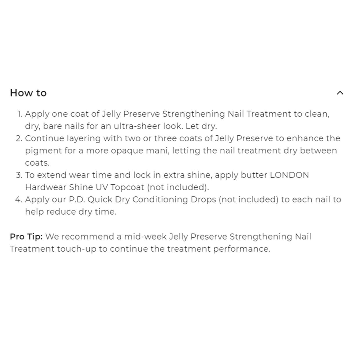 Pro Tip: We recommend a mid-week Jelly Preserve Strengthening Nail Health-Car-e touch-up to continue the Health-Wellness-Car-e performance.