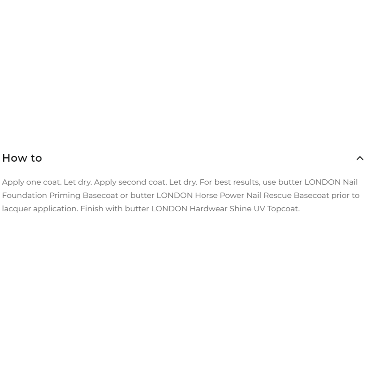 Apply one coat. Let dry. Apply second coat. Let dry. For best results, use butter LONDON Nail Foundation Priming Basecoat or butter LONDON Horse Power Nail Rescue Basecoat prior to lacquer application. Finish with butter LONDON Hardwear Shine UV Topcoat.