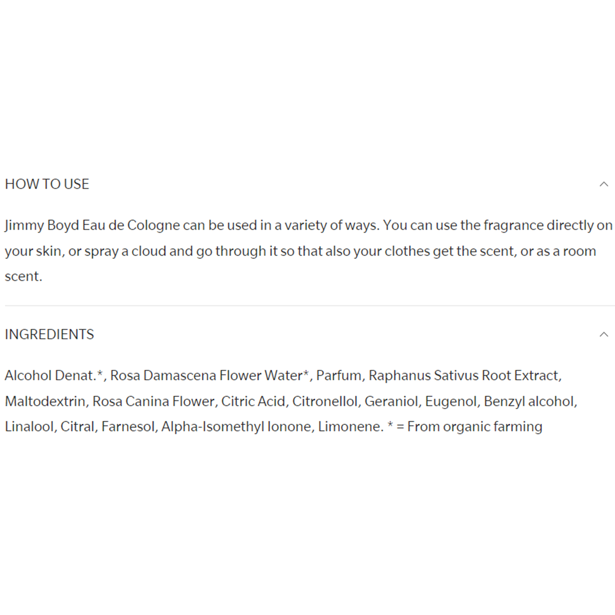 Jimmy Boyd Eau de Cologne can be used in a variety of ways. You can use the fragrance directly on your skin, or spray a cloud and go through it so that also your clothes get the scent, or as a room scent.