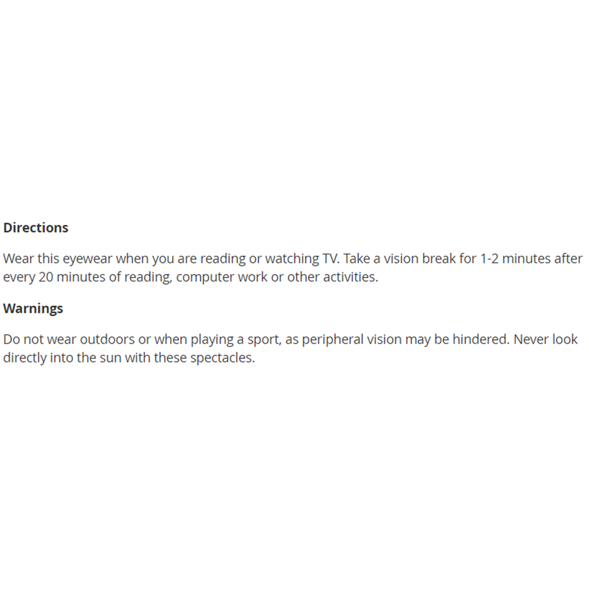 Do not wear outdoors or when playing a sport, as peripheral vision may be hindered. Never look directly into the sun with these spectacles.