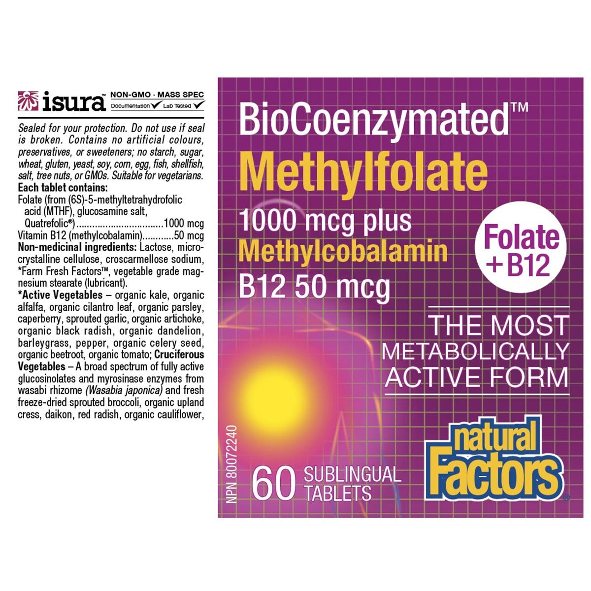 Natural Factors Methylfolate Plus Methylcobalamin is an innovative one-a-day formula that provides 1000 mcg of folate and 50 mcg of vitamin B12 alongside Farm Fresh Factors – a bioenergetic blend of phytonutrients – to Assist prevent folate deficiency. Research has shown that Quatrefolic, the metabolically active and coenzymated form of folate, results in a 3.1 times higher blood folate concentration of 5-MTHF than regular folic acid. Feel the difference!