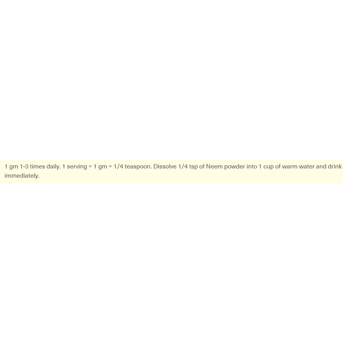 1 gm 1-3 times daily. 1 serving = 1 gm = 1/4 teaspoon. Dissolve 1/4 tsp of Neem powder into 1 cup of warm water and drink immediately.