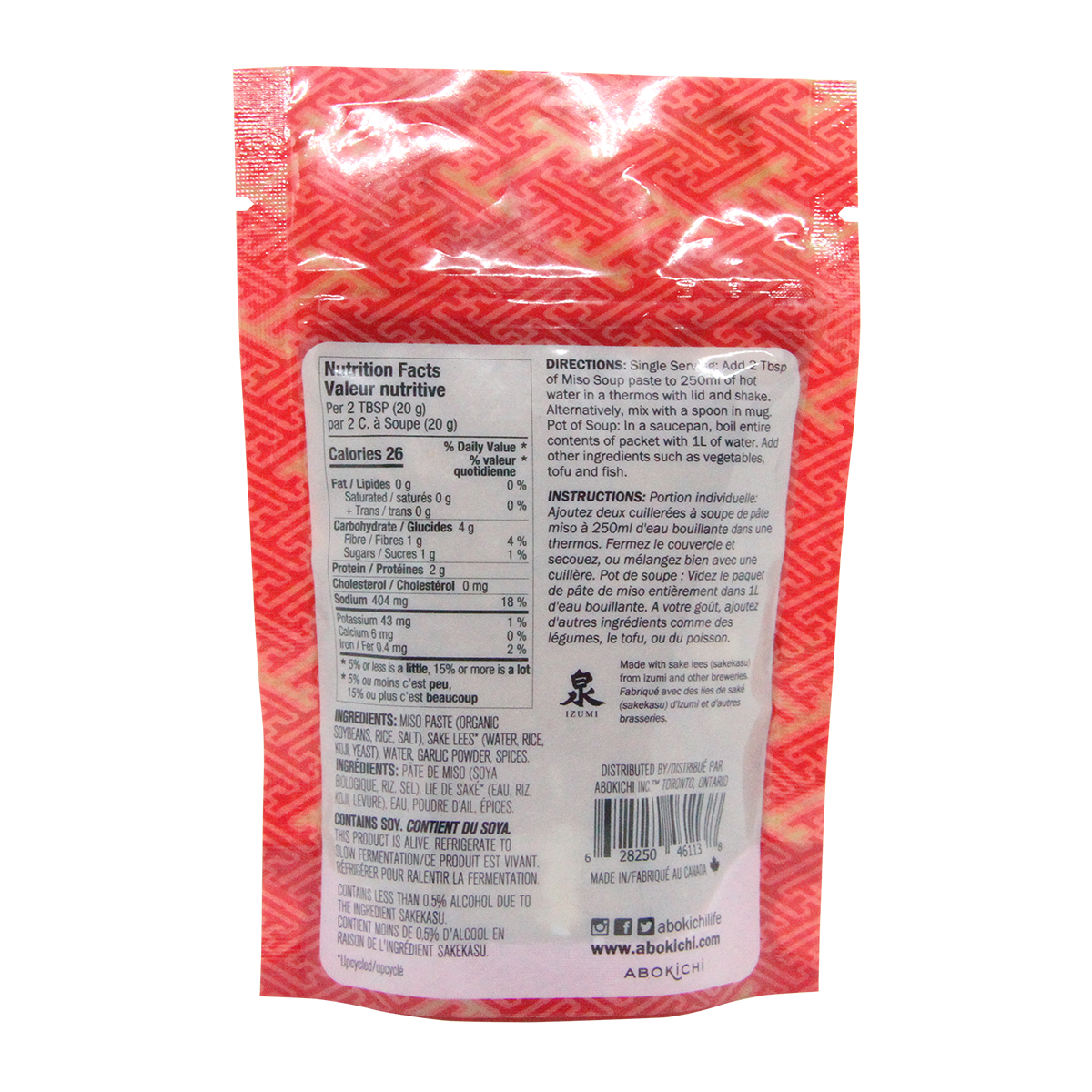 MISO PASTE (ORGANIC SOYBEANS, RICE, SALT), SAKE LEES (WATER, RICE, KOJI YEAST), WATER, GARLIC POWDER, SPICES. Contains: Soybeans.