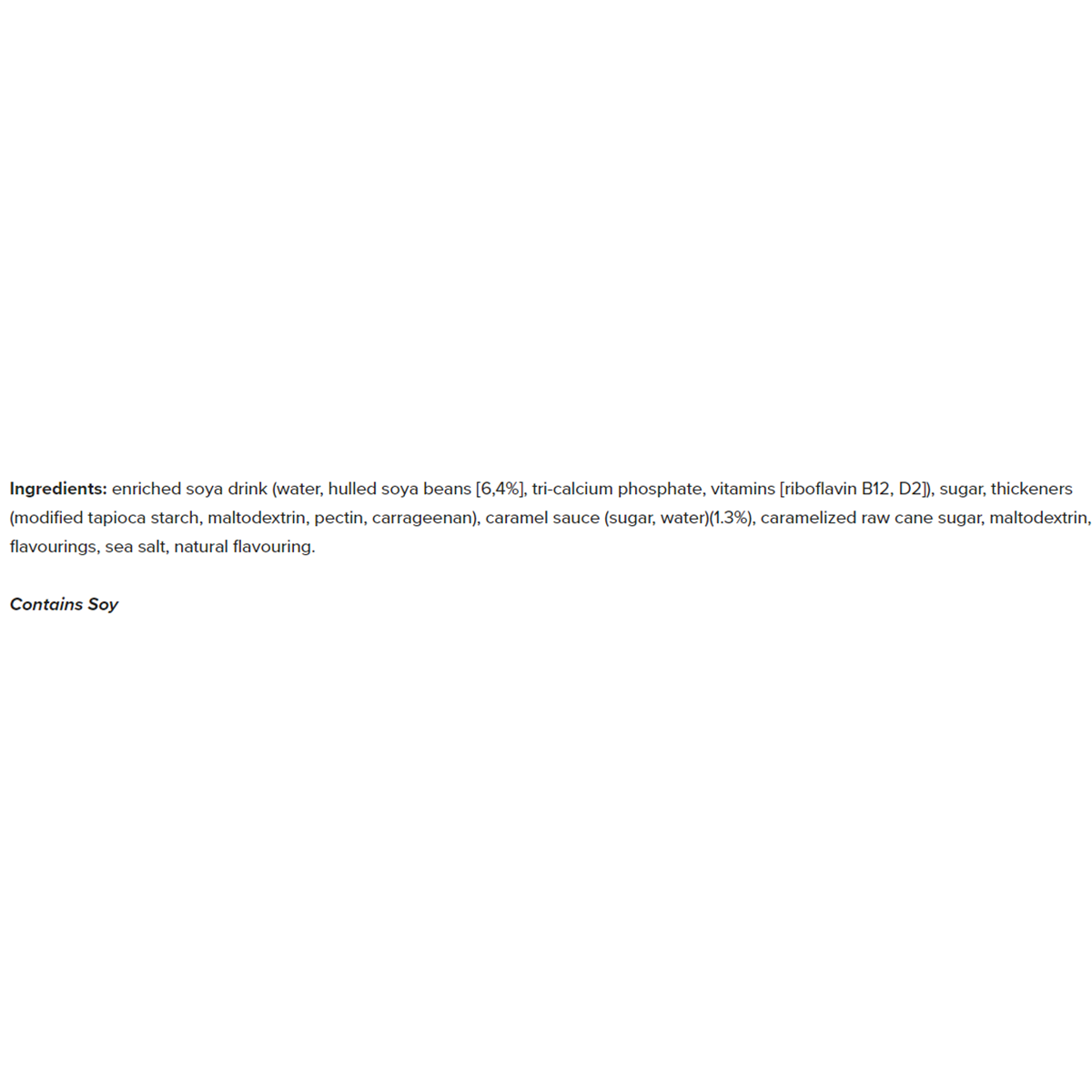 Enriched soya drink (water, hulled soya beans [6,4%], tri-calcium phosphate, vitamins [riboflavin B12, D2]), sugar, thickeners (modified tapioca starch, maltodextrin, pectin, carrageenan), caramel sauce (sugar, water)(1.3%), caramelized raw cane sugar, maltodextrin, flavourings, sea salt, natural flavouring.
