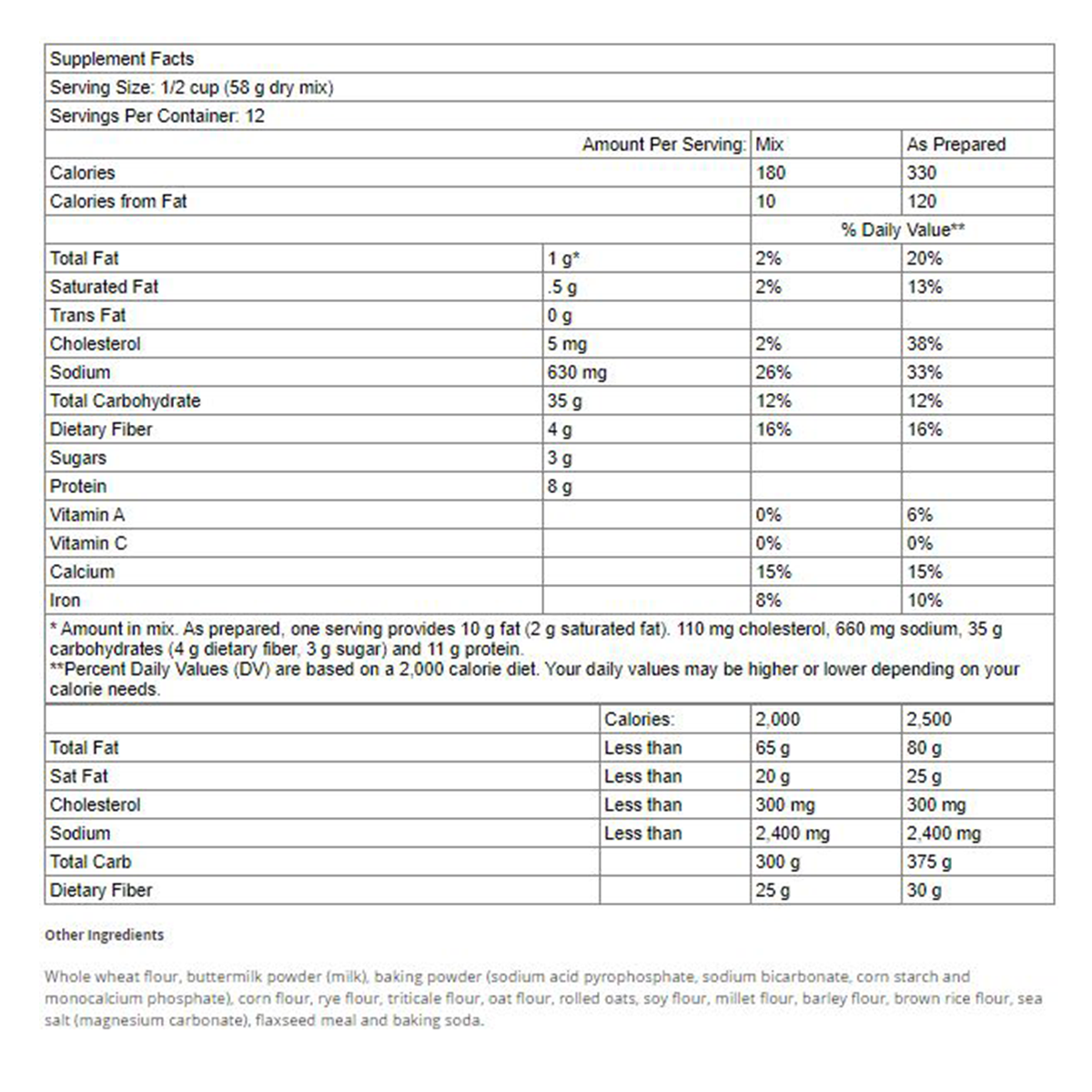 Whole wheat flour, buttermilk powder (milk), baking powder (sodium acid pyrophosphate, sodium bicarbonate, corn starch and monocalcium phosphate), corn flour, rye flour, triticale flour, oat flour, rolled oats, soy flour, millet flour, barley flour, brown rice flour, sea salt (magnesium carbonate), flaxseed meal and baking soda.
