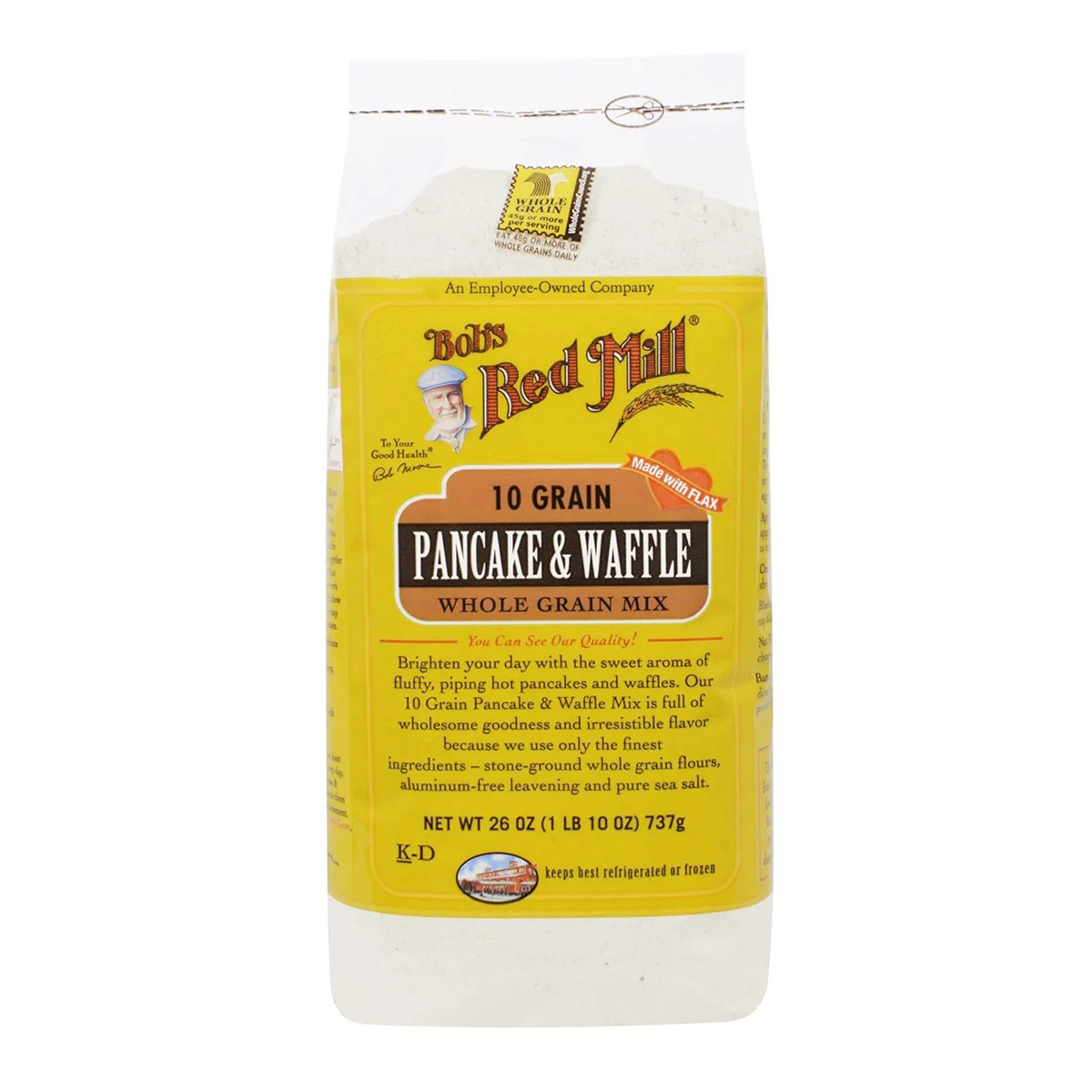 Brighten your day with the sweet aroma of fluffy, piping hot pancakes and waffles. Our 10 Grain Pancake and Waffle Mix is full of wholesome goodness and irresistible flavor because we use only the finest ingredients—a wonderful array of whole grain flours ground from wheat, rye, triticale, barley, corn, oats, brown rice, soybeans and flaxseeds. Thanks to these whole grain flours, Bob’s Red Mill 10 Grain Pancake and Waffle Mix makes hearty pancakes that are packed with fiber, protein, calcium and omega-3 fatty acids. It is incredibly nutritious and a great way to start your morning off right with a tasty and healthy whole grain breakfast.