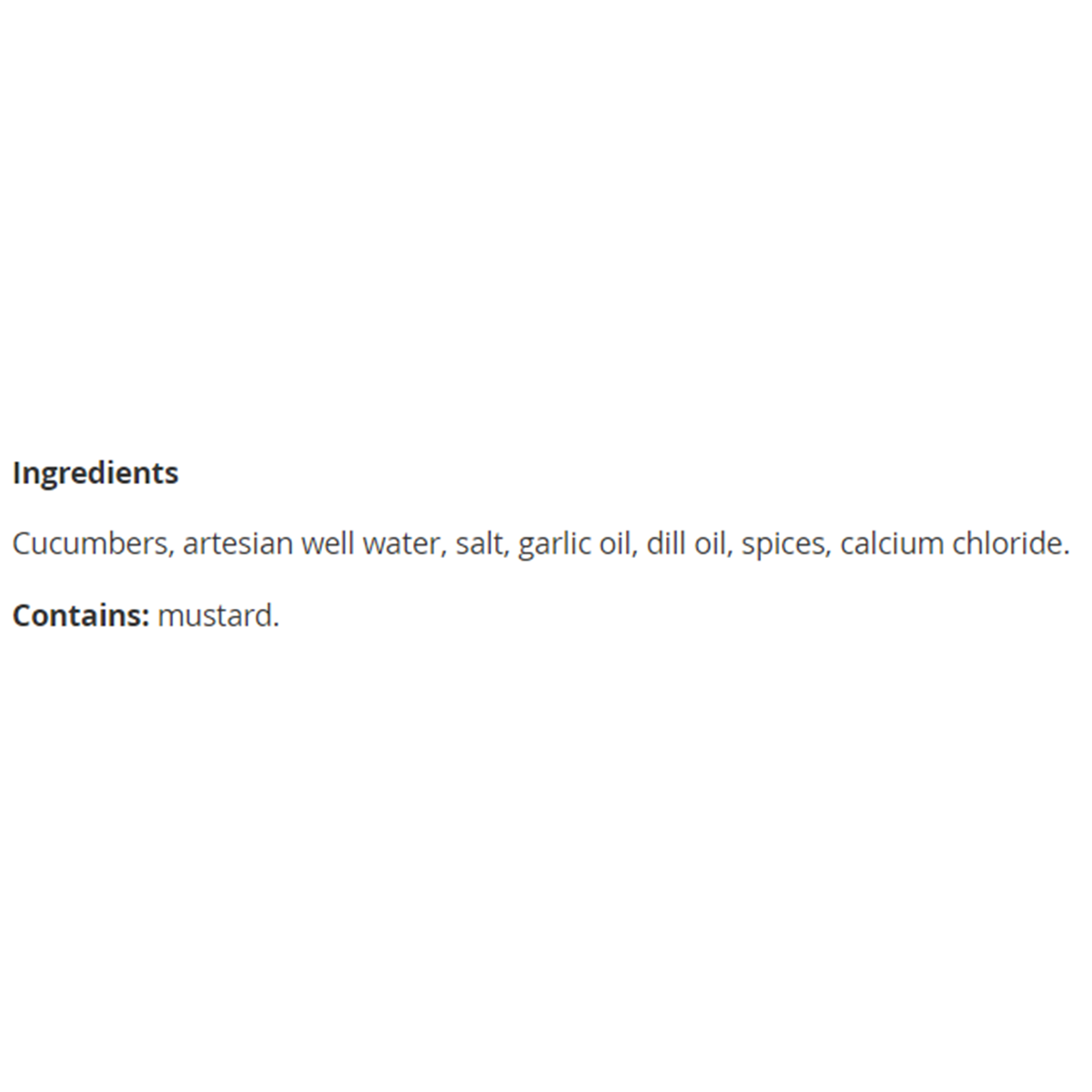 Cucumbers, artesian well water, salt, garlic oil, dill oil, spices, calcium chloride.