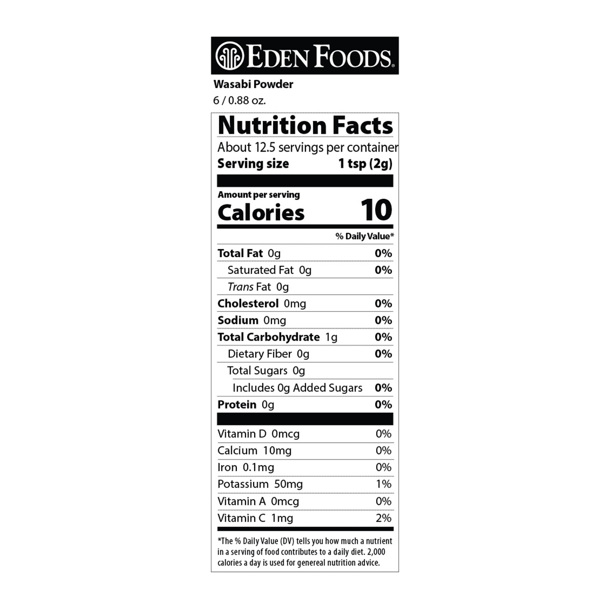 EDEN Wasabi Powder is made from washed, cut and dried wasabi (Japanese horseradish) and Western wasabi (horseradish) that is ground into a fine powder. Mustard seed is ground and most of the oil is extracted, leaving about 4 percent of the oil in the seed. The seed is then ground again into a fine powder. The remaining oil in the mustard powder is needed to bind the wasabi and horseradish powders. All of the powders are then combined and mixed before packaging in sealed containers to preserve flavor and nutrients.