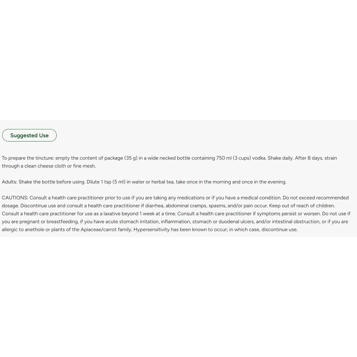 Consult a health Wellness-Care practitioner prior to use if you are taking any Health Products or if you have a medical condition. Do not exceed recommended dosage. Discontinue use and consult a health Wellness-Care practitioner if diarrhea, abdominal cramps, spasms, and/or pain occur. Keep out of reach of children. Consult a health Wellness-Care practitioner for use as a laxative beyond 1 week at a time. Consult a health Wellness-Care practitioner if symptoms persist or worsen. Do not use if you are pregnant or breastfeeding, if you have acute stomach irritation, inflammation, stomach or duodenal ulcers, and/or intestinal obstruction, or if you are allergic to anethole or plants of the Apiaceae/carrot family. Hypersensitivity has been known to occur; in which case, discontinue use.