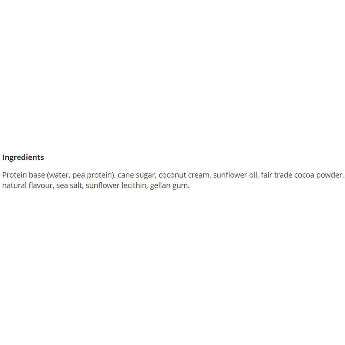 Protein base (water, pea protein), cane sugar, coconut cream, sunflower oil, fair trade cocoa powder, natural flavour, sea salt, sunflower lecithin, gellan gum.