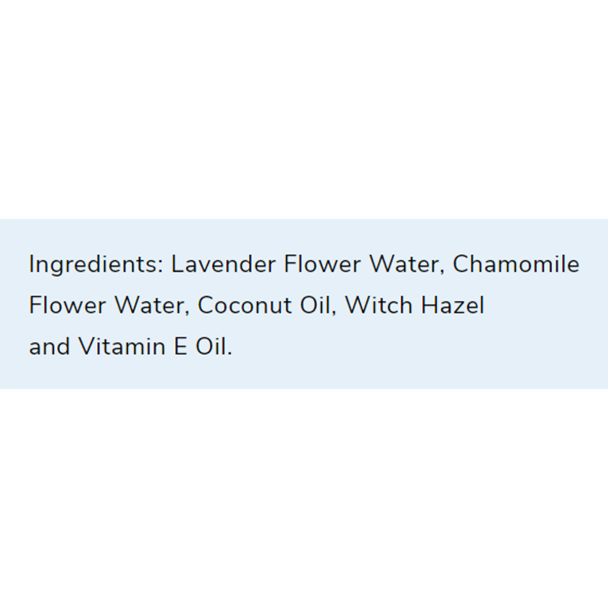 Lavender Flower Water, Chamomile Flower Water, Coconut Oil, Witch Hazel and Vitamin E Oil.