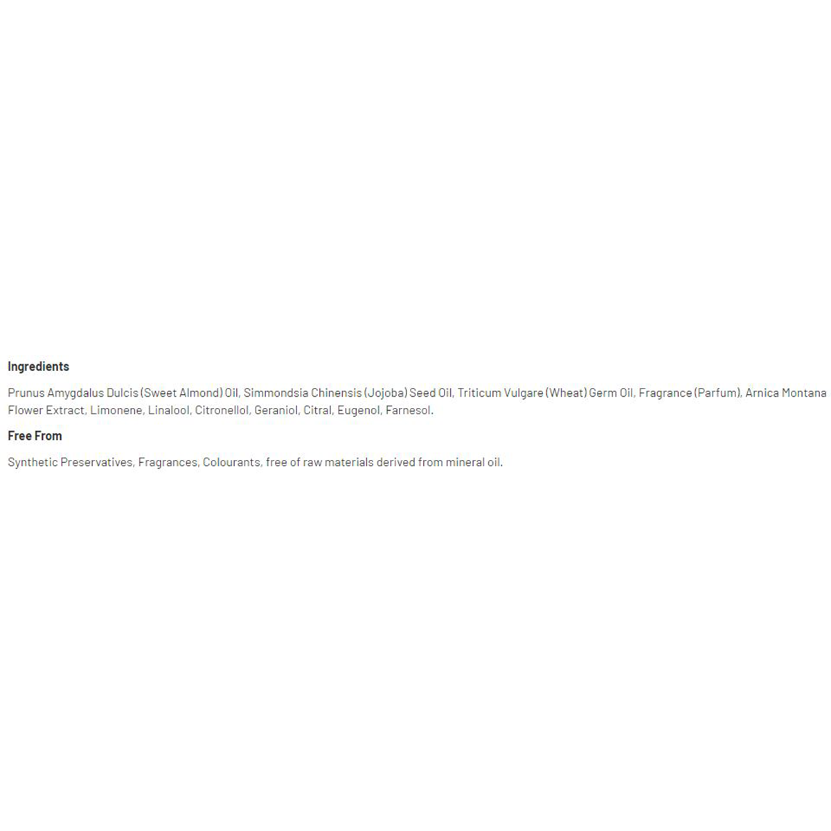 Prunus Amygdalus Dulcis (Sweet Almond) Oil, Simmondsia Chinensis (Jojoba) Seed Oil, Triticum Vulgare (Wheat) Germ Oil, Fragrance (Parfum), Arnica Montana Flower Extract, Limonene, Linalool, Citronellol, Geraniol, Citral, Eugenol, Farnesol.