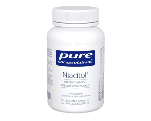 Niacitol features inositol nicotinate, a no-flush form of niacin (vitamin B3) that has been used in Europe for over 30 years to support healthy nutrient metabolism. Niacitol is a well-tolerated form of vitamin B3 and is unlikely to cause the flushing (redness, warmth, and itching of the skin) or other side effects commonly associated with niacin. Inositol nicotinate consists of one molecule of inositol and six molecules of niacin. Niacin plays a crucial role in nearly all aspects of energy metabolism. Its coenzymes, NAD and NADP, are the most important electron transport carriers in cells, assisting in metabolic processes related to the breakdown and utilization of macronutrients. More than 200 metabolic reactions require niacin, including those involved in glycolysis, the Krebs cycle, and β-oxidation of fatty acids.