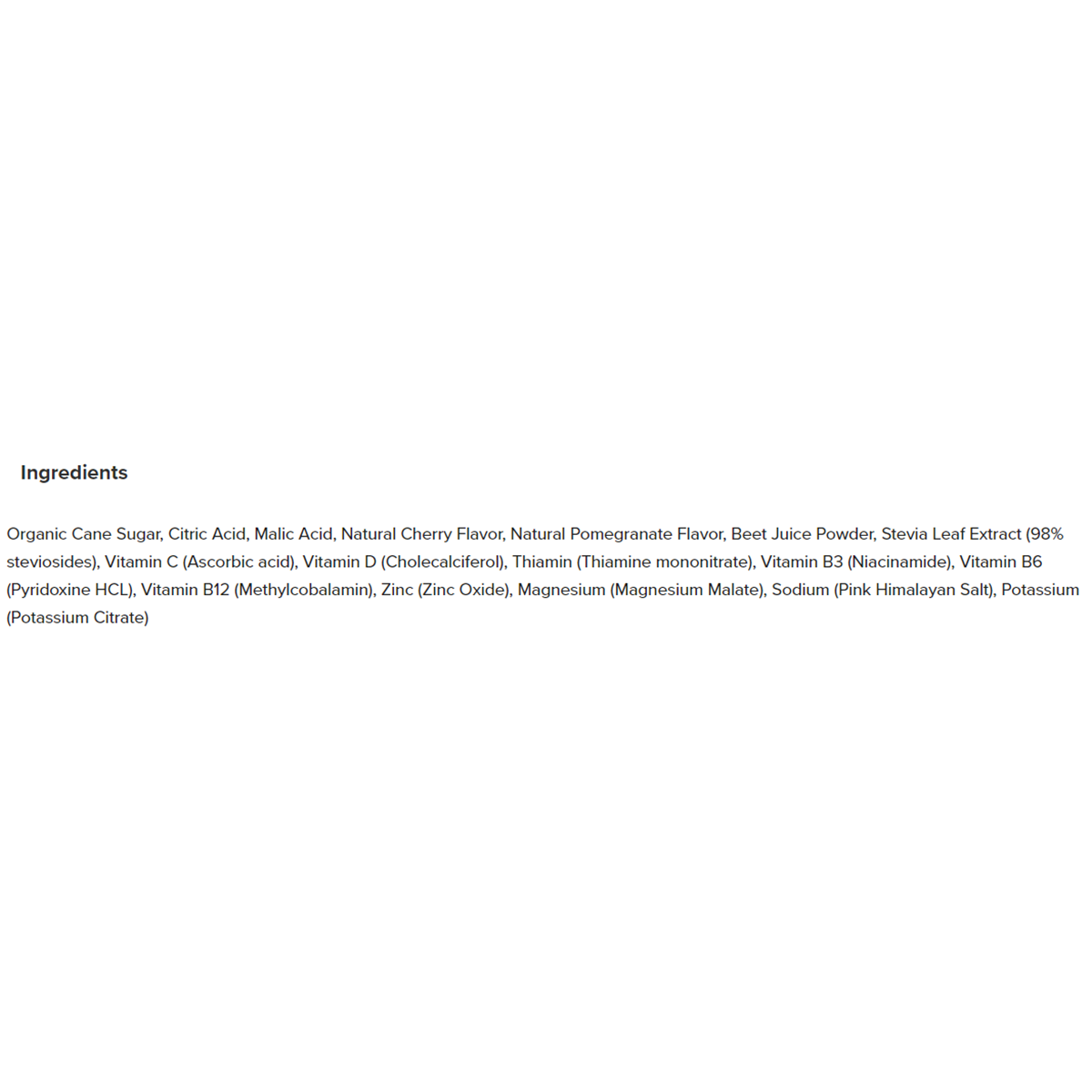 Organic Cane Sugar, Citric Acid, Malic Acid, Natural Cherry Flavor, Natural Pomegranate Flavor, Beet Juice Powder, Stevia Leaf Extract (98% steviosides), Vitamin C (Ascorbic acid), Vitamin D (Cholecalciferol), Thiamin (Thiamine mononitrate), Vitamin B3 (Niacinamide), Vitamin B6 (Pyridoxine HCL), Vitamin B12 (Methylcobalamin), Zinc (Zinc Oxide), Magnesium (Magnesium Malate), Sodium (Pink Himalayan Salt), Potassium (Potassium Citrate).