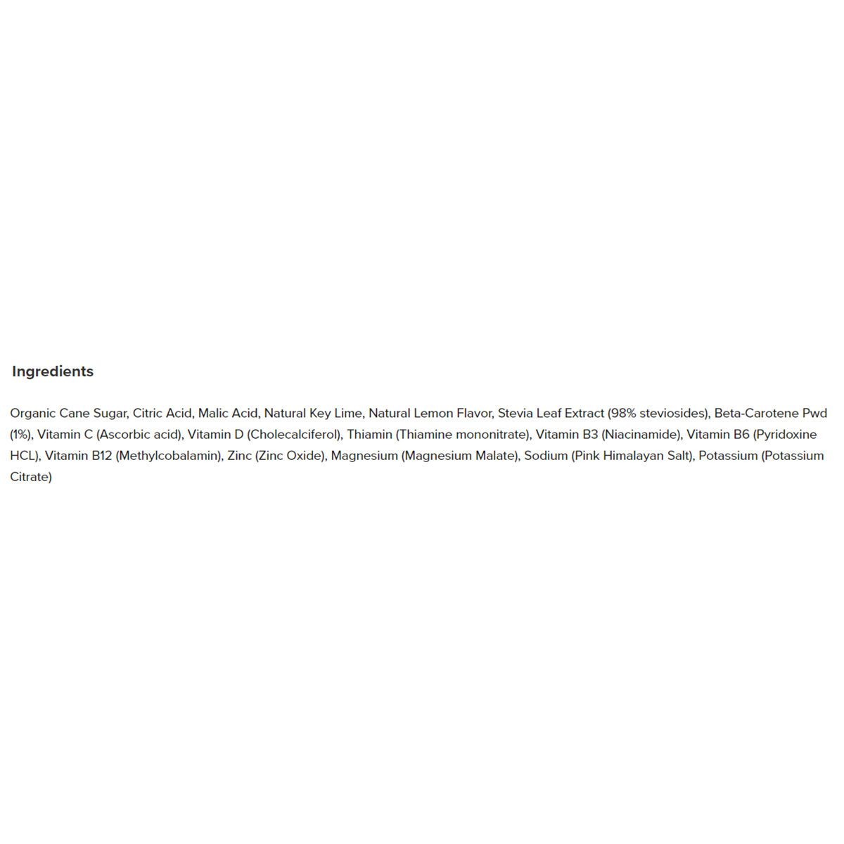 Organic Cane Sugar, Citric Acid, Malic Acid, Natural Key Lime, Natural Lemon Flavor, Stevia Leaf Extract (98% steviosides), Beta-Carotene Pwd (1%), Vitamin C (Ascorbic acid), Vitamin D (Cholecalciferol), Thiamin (Thiamine mononitrate), Vitamin B3 (Niacinamide), Vitamin B6 (Pyridoxine HCL), Vitamin B12 (Methylcobalamin), Zinc (Zinc Oxide), Magnesium (Magnesium Malate), Sodium (Pink Himalayan Salt), Potassium (Potassium Citrate).