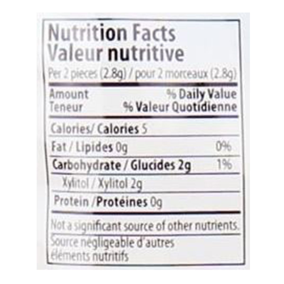 Peppermint - xylitol, gum base, gum arabic, natural flavours, glycerol, carnauba wax, tocopherols.