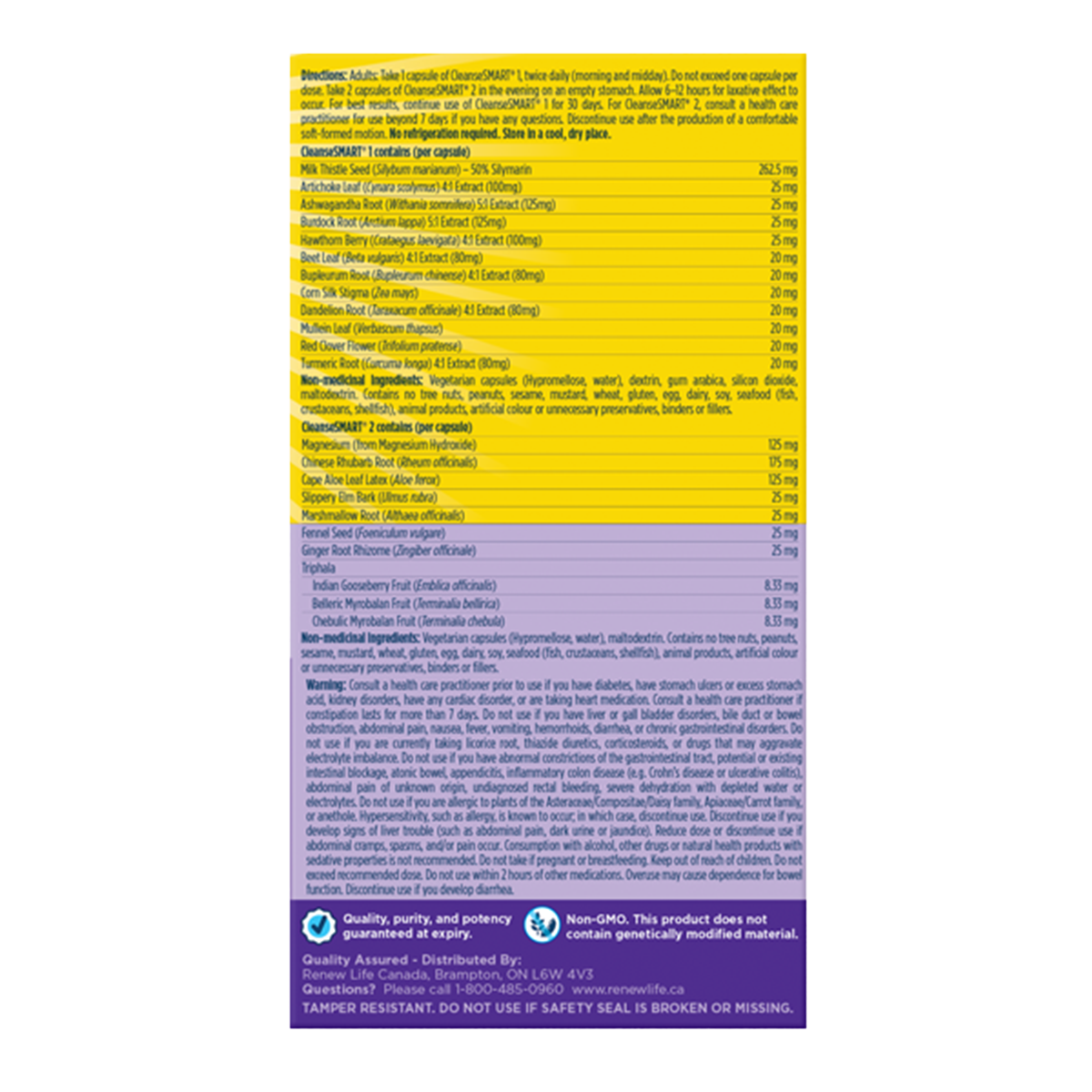 Renew Life’s CleanseSMART Kit is a two-part, 30-day herbal cleansing program specifically formulated to cleanse and detoxify the entire body, with added focus on the body’s two main detoxification pathways, the liver and the colon. Designed to reduce the toxic load in your body and relieve occasional constipation, CleanseSMART also contains silymarin, a mixture of flavonolignans isolated from the botanical seed milk thistle, an herbal ingredient traditionally used for liver Safeguardion.