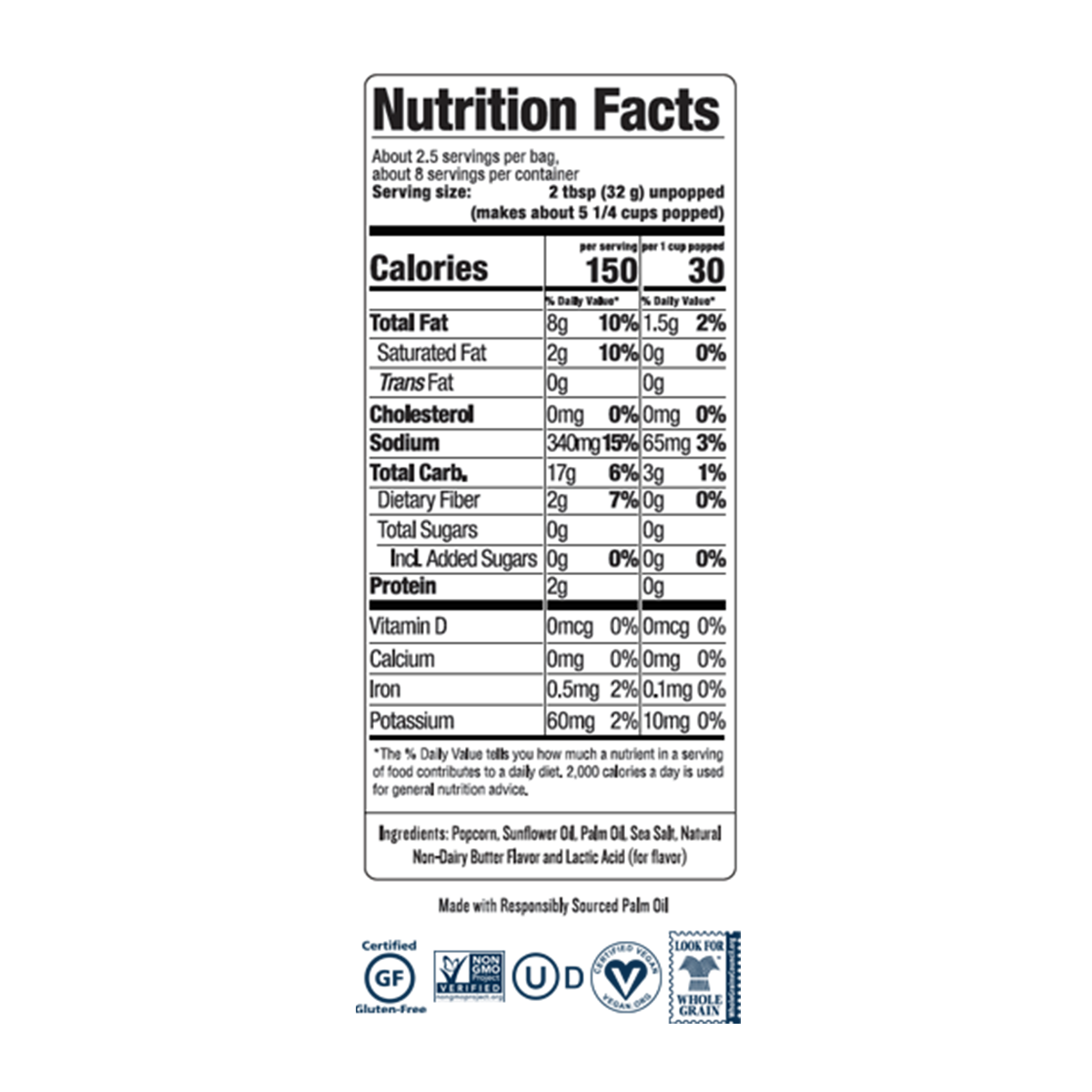 Serving size: 2 tbsp (32 g) unpopped (makes about 5 1/4 cups popped)