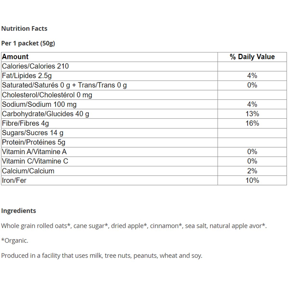 Whole grain rolled oats*, cane sugar*, dried apple*, cinnamon*, sea salt, natural apple avor*.