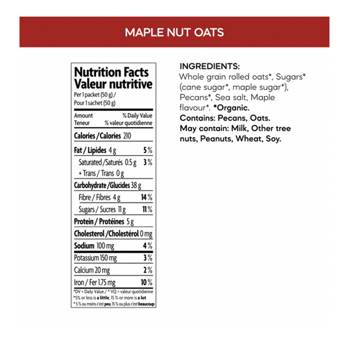 Whole grain rolled oats*, Sugars* (cane sugar, maple sugar*), Pecans, Sea salt, Maple flavour*. *Organic.