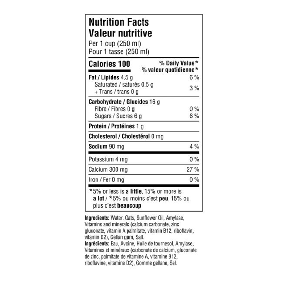Water, Oats, Sunflower Oil, Amylase, Vitamins And Minerals ( Calcium Carbonate, Zinc, Gluconate, Vitamin A Palmitate, Vitamin B12, Riboflavin, Vitamin D2), Gellan Gum, Salt.