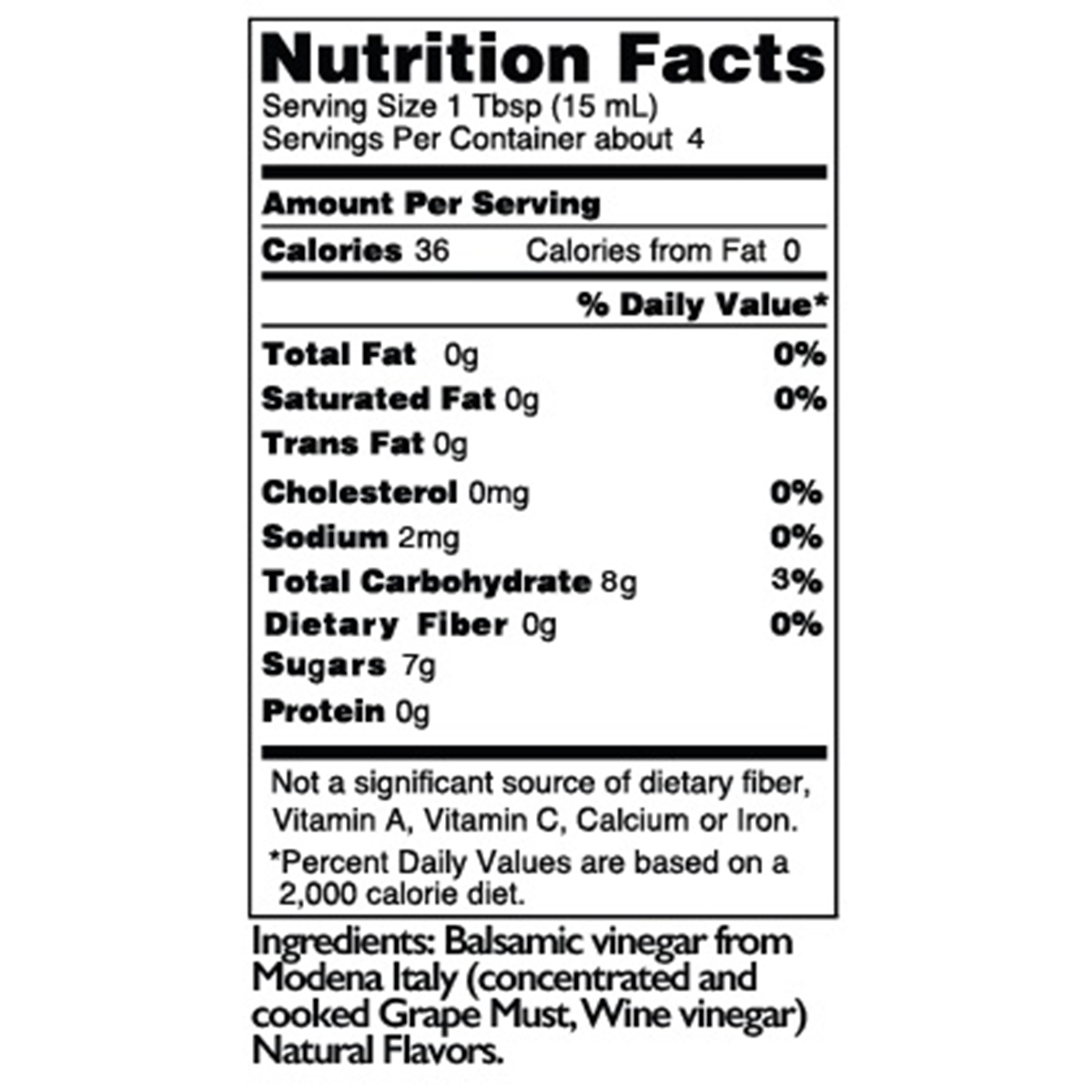 Balsamic vinegar from Modena Italy (concentrated and cooked Grape Must, Wine vinegar) Natural Flavors.