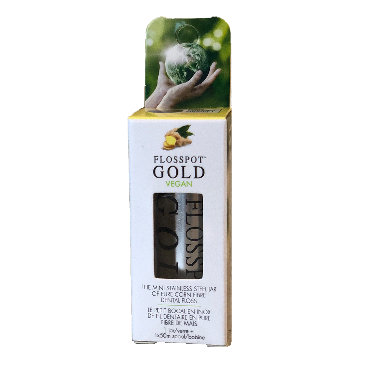This original floss, Flosspot Silk, is a refillable mini mason jar filled with a 40m spool of luxurious silk dental floss, lightly waxed for strength and ease of use between tight teeth, lab tested for purity. Flosspot Gold is a refillable stainless steel jar filled with a 50m spool of floss made of PLA from corn, an alternative to fossil-based plastics, lab tested for purity and compostability.