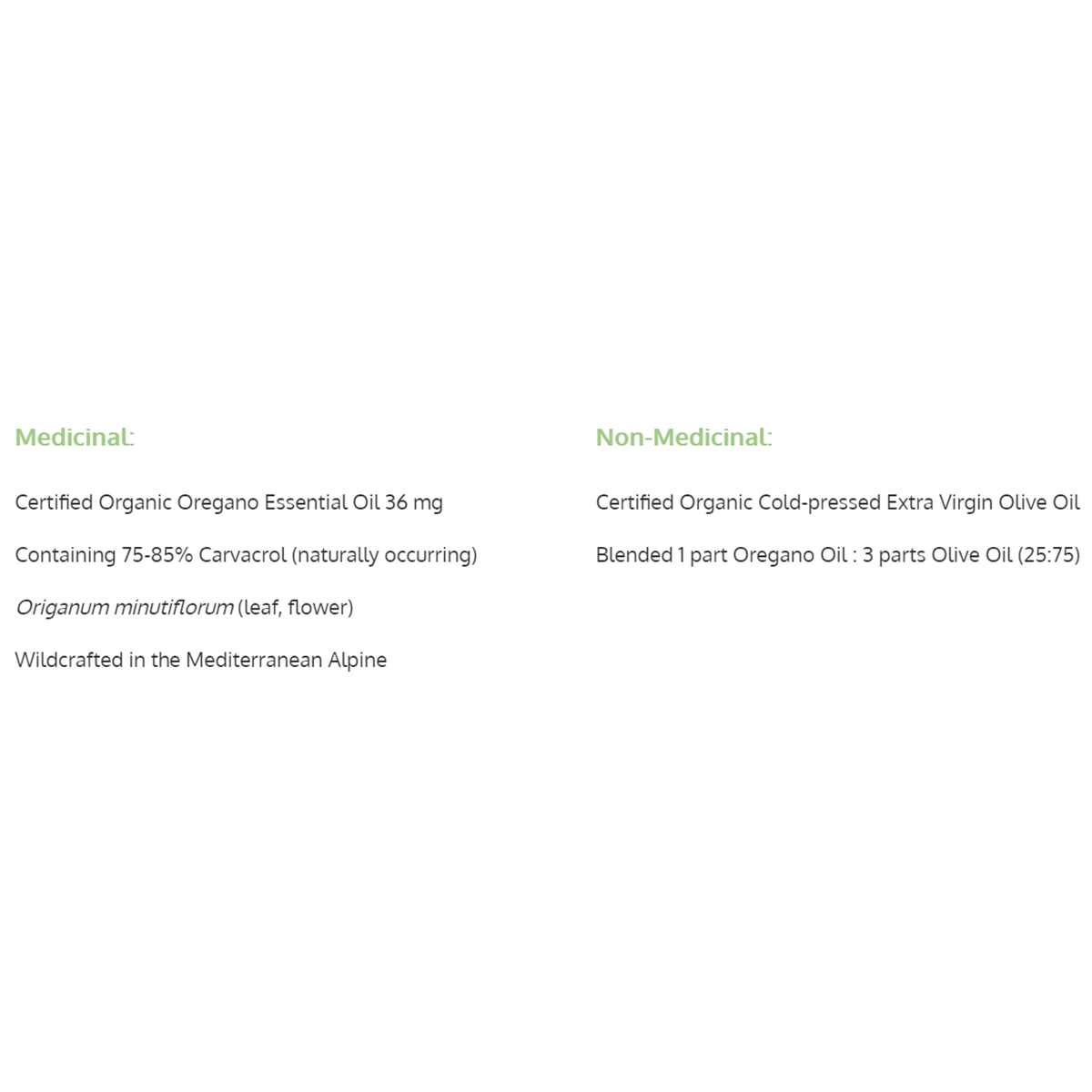 This wild and certified organic Origanum Minutiflorum is carefully handpicked at high elevations and processed using traditional steam distillation at lower temperatures. The result is a pure, unadulterated, all-natural oregano oil containing the full-spectrum phytochemistry of this high-mountain species.