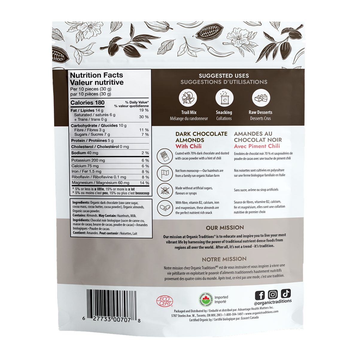 We've created a healthy and nutritious snack by combining two delicious foods. Our non-pasteurized, sustainably grown almonds are tumbled and lightly dusted with organic cocoa powder and chili, offering a lightly sweetened and slightly spicy flavor. They are also a good source of calcium, vitamin B2, and fiber.