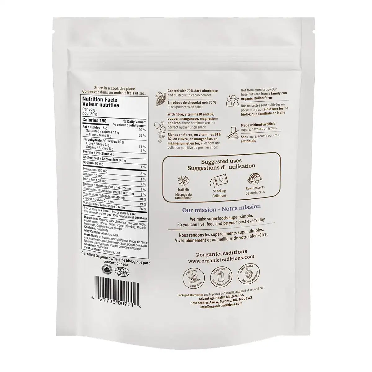 Non-pasteurized, sustainably grown hazelnuts tumbled and lightly dusted in organic cocoa powder.