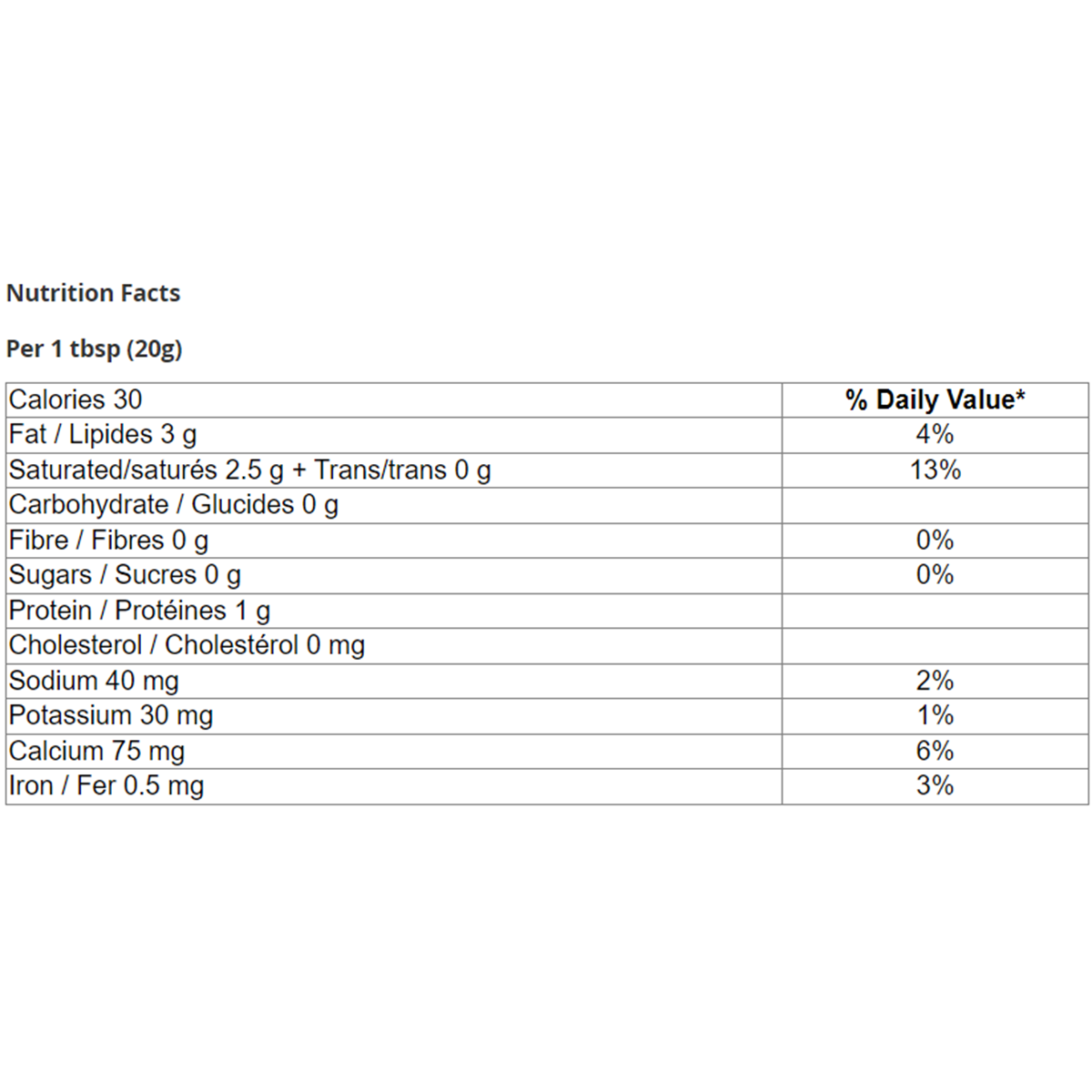 Saturated/saturés 2.5 g + Trans/trans 0 g