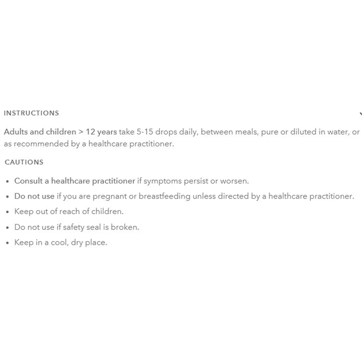 Adults and children > 12 years take 5-15 drops daily, between meals, pure or diluted in water, or as recommended by a healthcare practitioner.