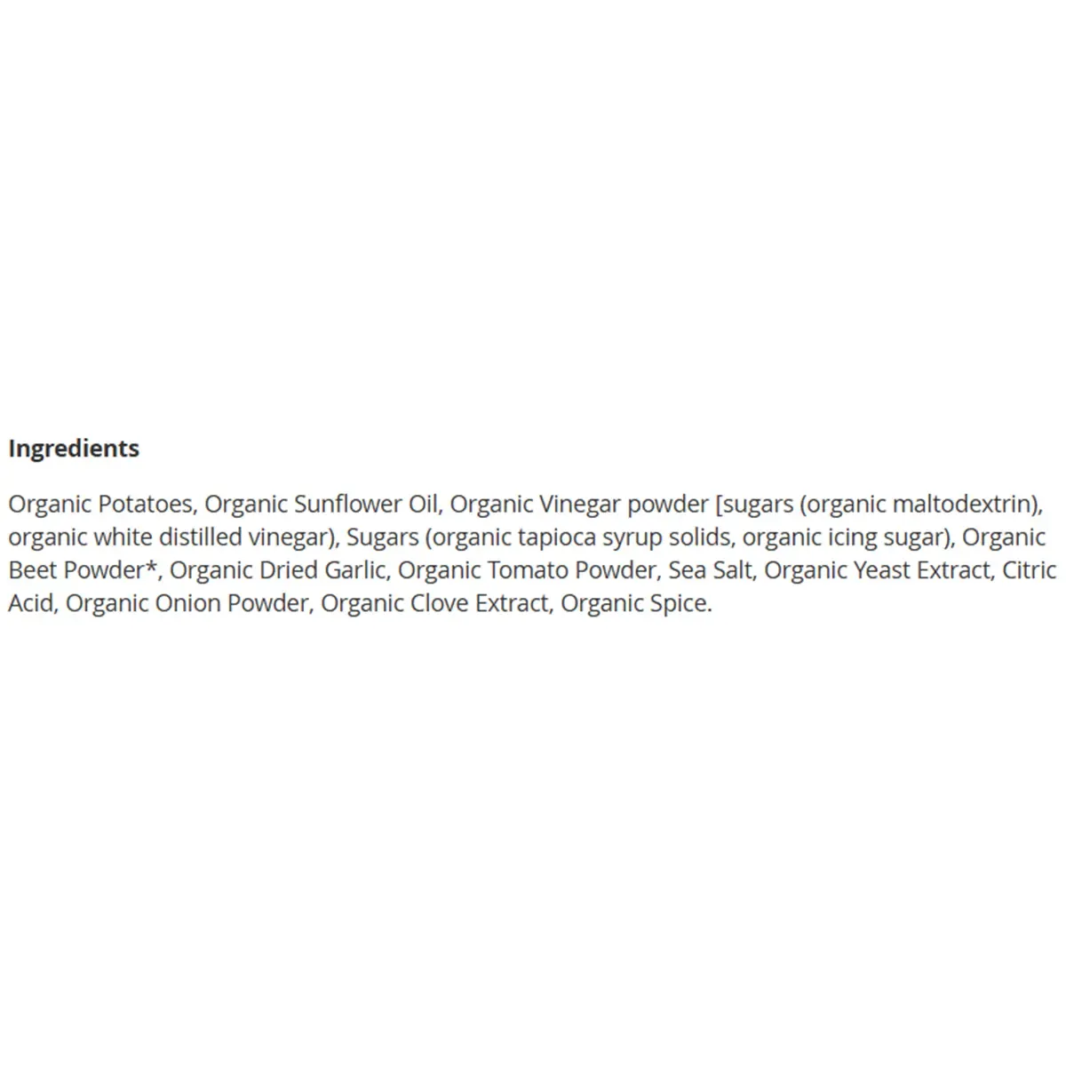 Organic Potatoes, Organic Sunflower Oil, Organic Vinegar powder [sugars (organic maltodextrin), organic white distilled vinegar), Sugars (organic tapioca syrup solids, organic icing sugar), Organic Beet Powder*, Organic Dried Garlic, Organic Tomato Powder, Sea Salt, Organic Yeast Extract, Citric Acid, Organic Onion Powder, Organic Clove Extract, Organic Spice.