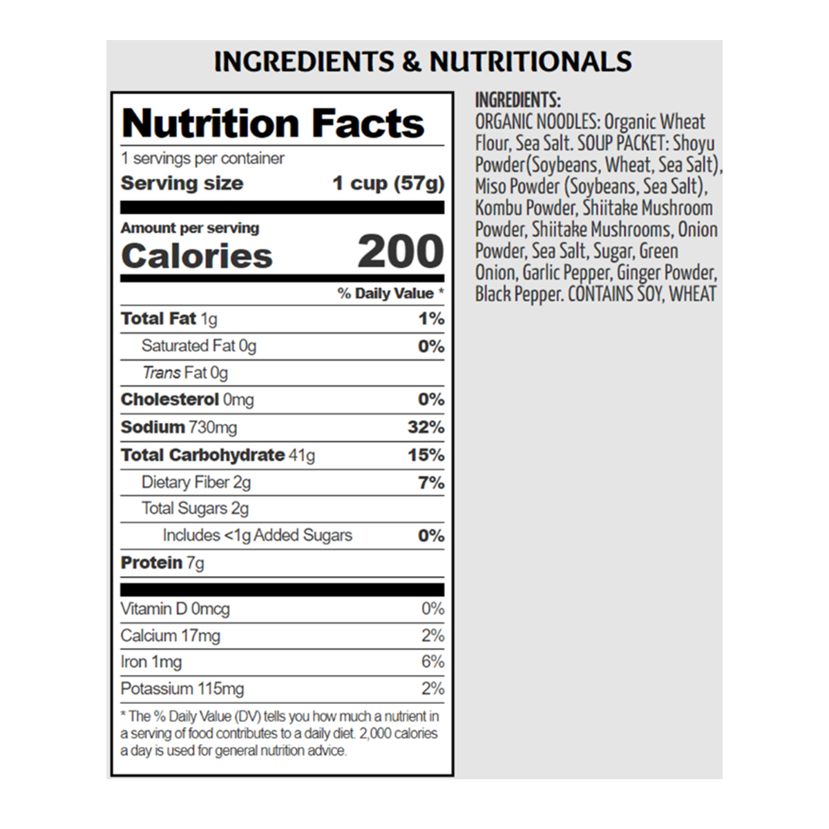 SOUP PACKET: Shoyu Powder (Soybeans, Wheat, Sea Salt), Miso Powder (Soybeans, Sea Salt), Kombu Powder, Shiitake Mushroom Powder, Shiitake Mushrooms, Onion Powder, Sea Salt, Sugar, Green Onion, Garlic Pepper, Ginger Powder, Black Pepper.
