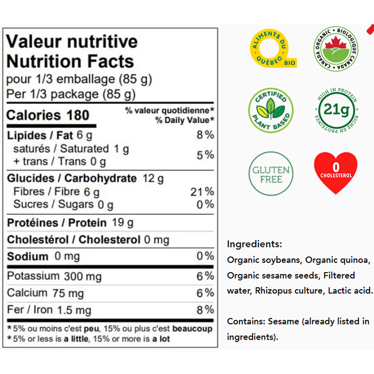Organic soybeans, Organic quinoa, Organic sesame seeds, Filtered water, Rhizopus culture, Lactic acid.