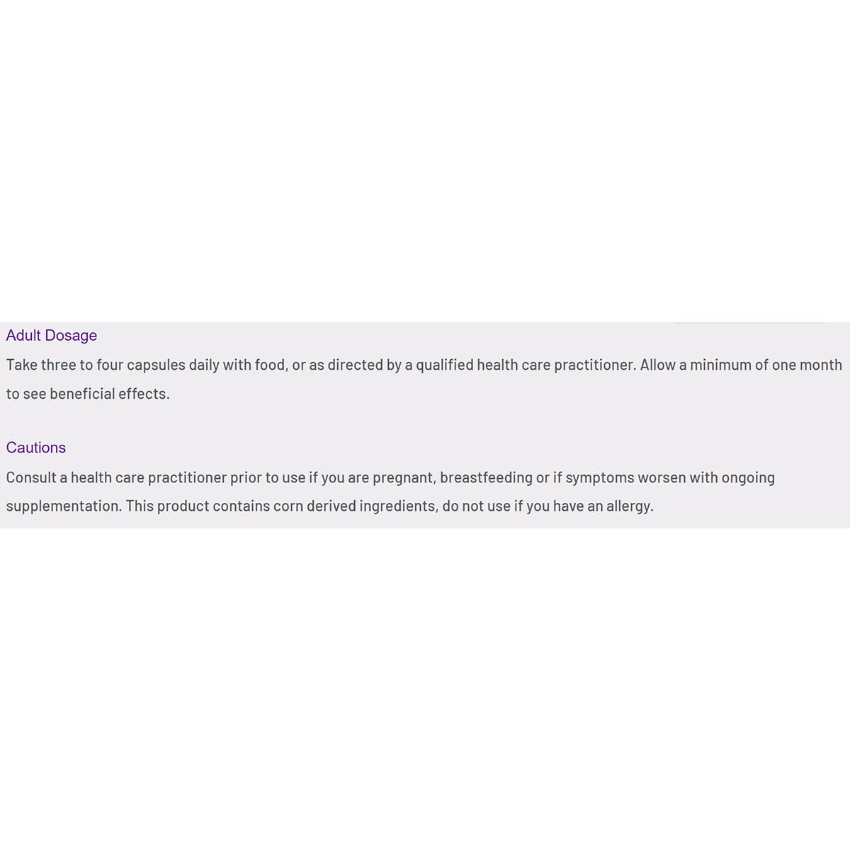 Take three to four capsules daily with food, or as directed by a qualified health Wellness-Care practitioner. Allow a minimum of one month to see beneficial effects.