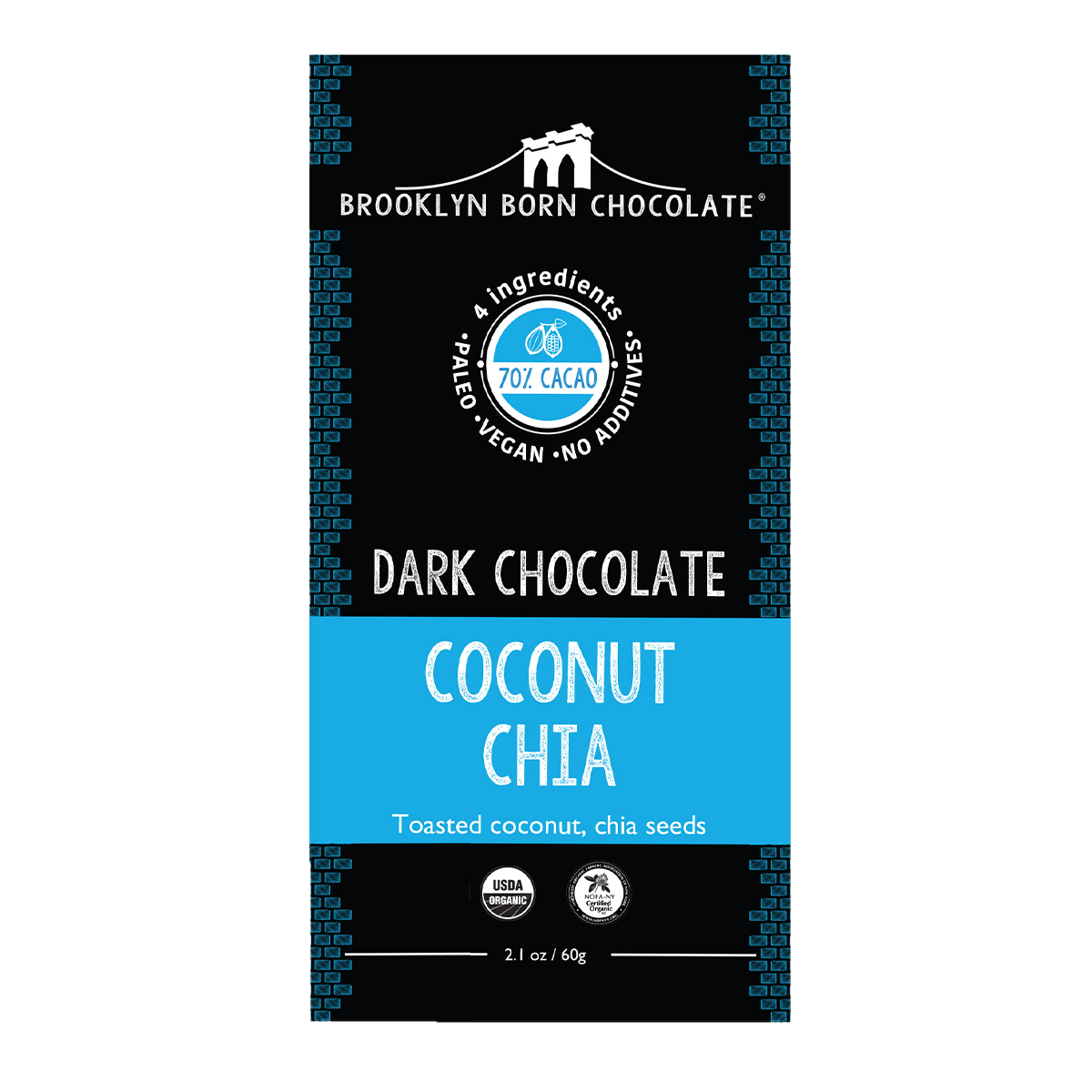 Organic bittersweet chocolate (organic chocolate liquor, organic cocoa butter, organic coconut sugar) organic coconut, organic chia seeds.