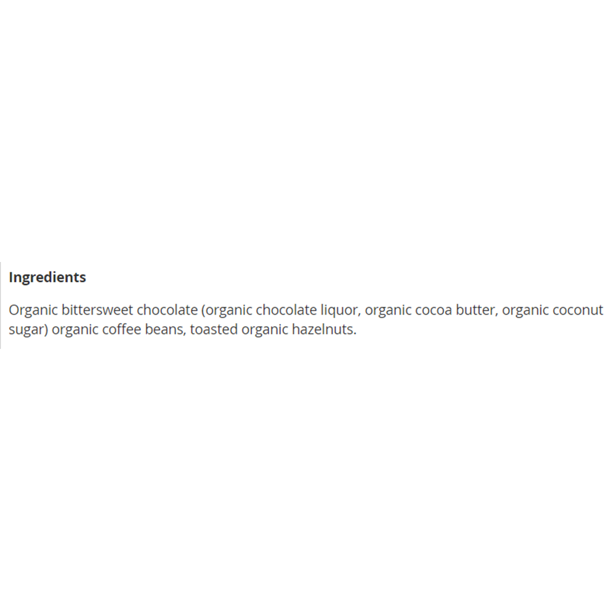 Organic bittersweet chocolate (organic chocolate liquor, organic cocoa butter, organic coconut sugar) organic coffee beans, toasted organic hazelnuts.