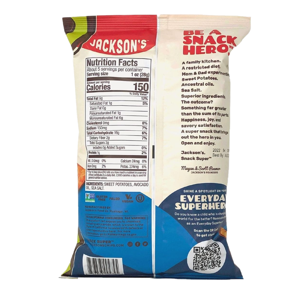 Straightforward. Crunchy. Delicious. Jackson's Sweet Potato Chips consist of only three ingredients: non-GMO sweet potatoes, avocado oil, and a hint of sea salt. We employ a slow-cooking method to enhance the natural flavor of sweet potatoes and achieve an irresistibly crunchy texture. It encapsulates everything you enjoy about potato chips but executed flawlessly. Jackson’s maintains simplicity and excellence, delivering the perfect snack-worthy chip.