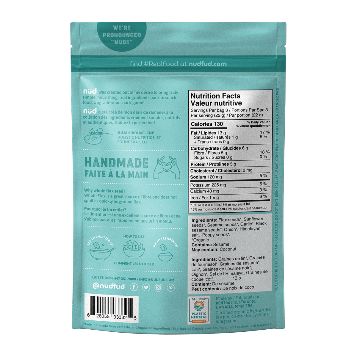 Made from only pure, no BS ingredients like activated golden flax, sunflower and sesame seeds. Gut-friendly, nut-free, and packed with filling good fats, 5g protein, 5g fibre and 1g net carbs per serving (for those who may be counting).