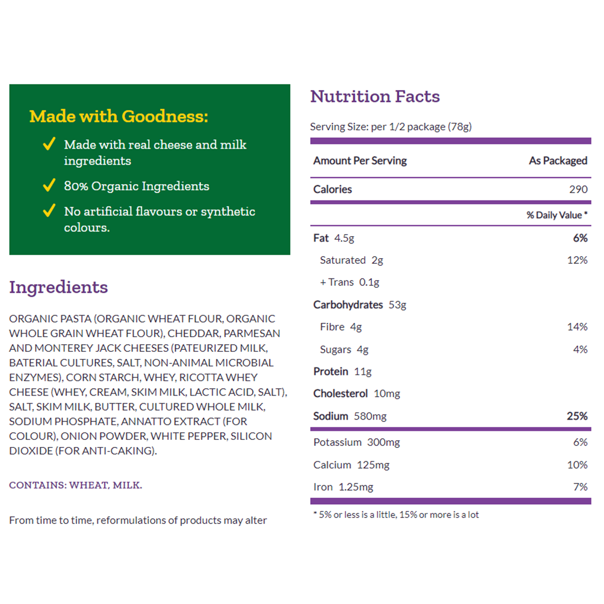 Organic Pasta (Organic Wheat Flour, Organic Whole Grain Wheat Flour), Cheddar, Parmesan And Monterey Jack Cheeses (Pateurized Milk, Baterial Cultures, Salt, Non-Animal Microbial Enzymes), Corn Starch, Whey, Ricotta Whey Cheese (Whey, Cream, Skim Milk, Lactic Acid, Salt), Salt, Skim Milk, Butter, Cultured Whole Milk, Sodium Phosphate, Annatto Extract (For Colour), Onion Powder, White Pepper, Silicon Dioxide (For Anti-Caking).